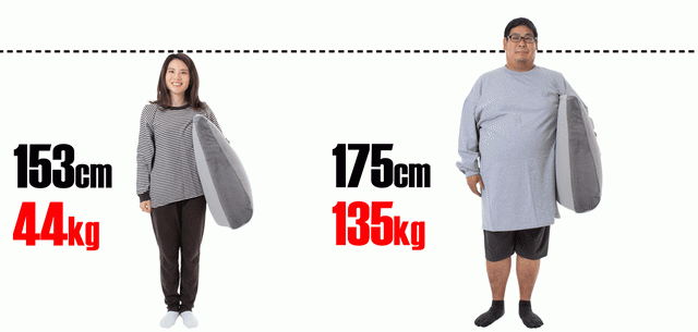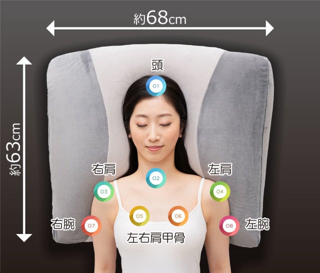 「超熟プレミアム枕」は、(約)奥行63cm×幅68cmと「体の約30%」を包み込むビッグサイズで、頭・首・右肩・左肩・右上腕・左上腕・右肩甲骨・左肩甲骨の8カ所にすき間なくフィットする為、高い体圧分散性を実現しました。