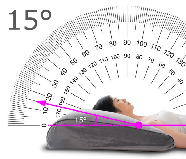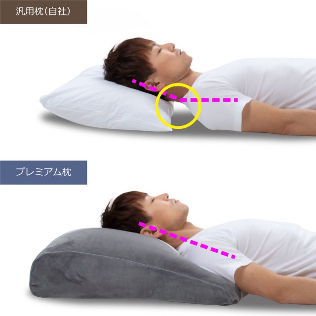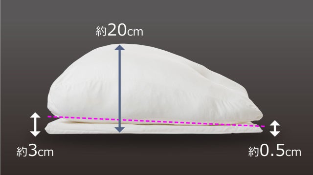 「超熟プレミアム枕」の形状は頭頂部から背中部にかけてなだらかに傾斜しています。寝たときの体の角度が約15度になるように設計しているので、枕から布団への段差を抑えることでき違和感を感じにくく、気道が確保され呼吸のしやすい角度になっています。