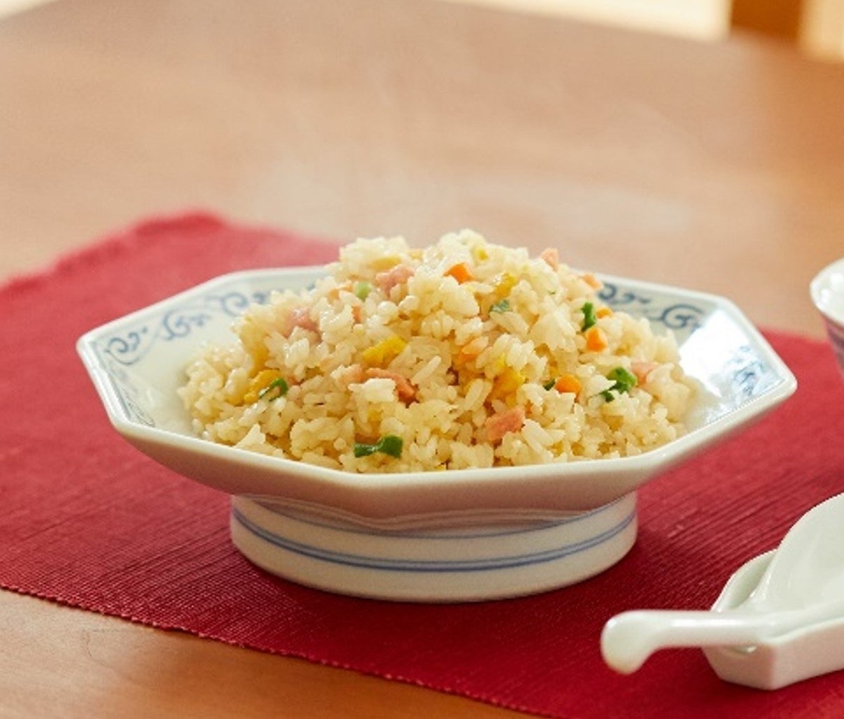 今回のリニューアルでは、当社独自の調味技術で、一般的なチャーハンと比べて約28%減塩(※)しました。また、カロリーも約25%オフ(※)で、コレステロール0の身体にうれしいチャーハンです。