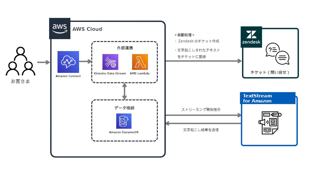 Amazon Connect(※1)の通話音声をテキスト化する株式会社アドバンスト・メディアが提供する、音声認識 API「 AmiVoice TextStream for Amazon Connect 」(※2)と Zendesk を連携し、テキスト情報を終話後に Zendesk へ反映できる仕組みです。また本サービスは、株式会社エクレクトが提供しています。