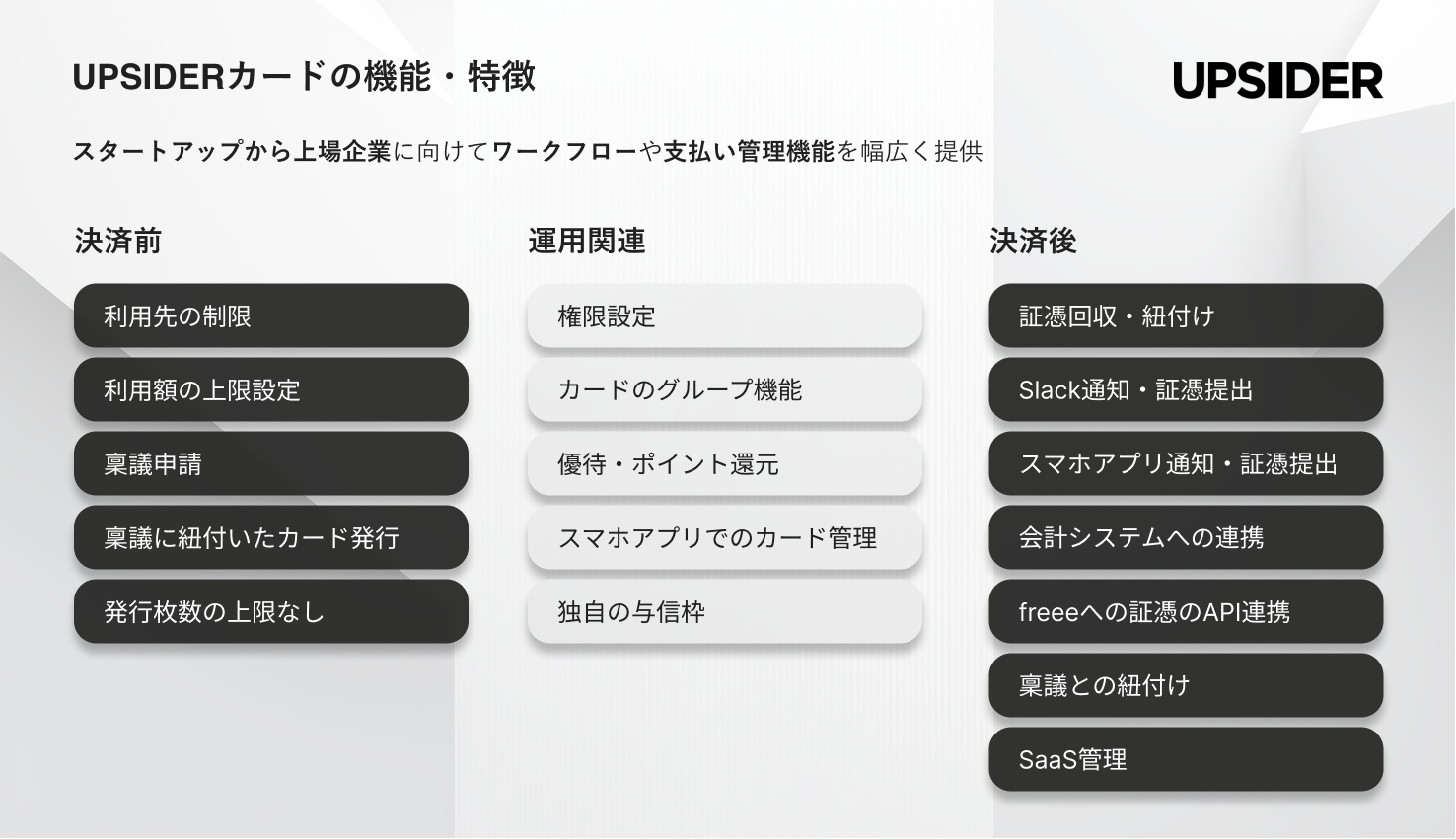 当社はかなり初期の段階でUPSIDERカードを導入できたので、比較的スムーズに処理できていたと思います。会社が拡大するにつれ、契約しているSaaSプロダクトの数も増えてきましたので、もしUPSIDERがなかったら「やってられなかったな」と思います。