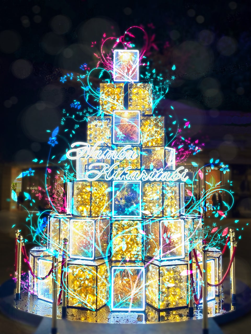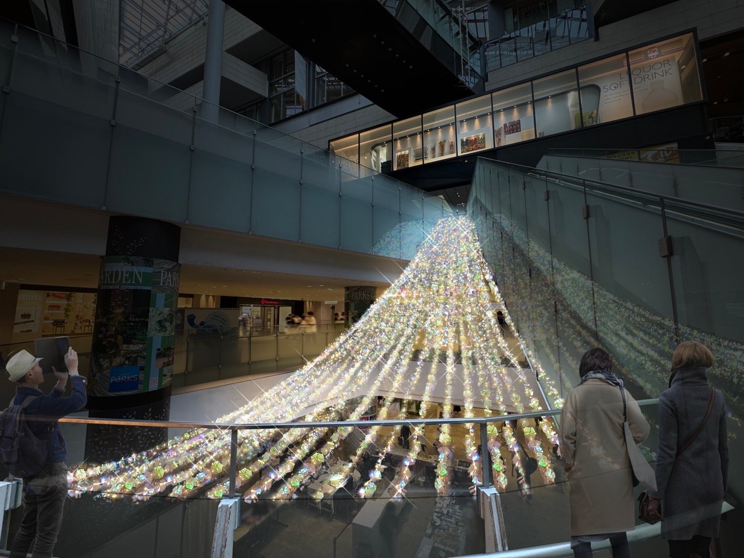 今年は、なんばCITYの本館吹き抜けに全長約14mのオーロラをイメージしたイルミネーションオブジェが新たに登場するなどイルミネーションエリアが拡大します。また、なんばパークスに設置される2階「シャイニングツリー」と8階「煌めく草原」にスマートフォンのカメラをかざすことで、立体的な花やキラキラしたエフェクトなどが現れるAR演出が加わり、イルミネーションのもう一つの姿をお楽しみいただけます。
