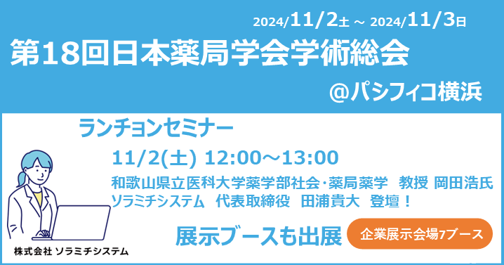 「第18回日本薬局学会学術総会」の11/2開催のランチョンセミナーに、和歌山県立医科大学薬学部社会・薬局薬学 教授 岡田 浩氏とソラミチシステム代表 田浦 貴大が登壇!