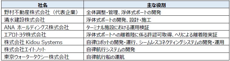 野村不動産株式会社(代表事業者、本社:東京都港区/代表取締役社長:松尾大作)、清水建設株式会社 (本社:東京都中央区/取締役社長:新村達也)、ANAホールディングス株式会社(本社:東京都港区/代表取締役社長:芝田浩二)、エアロトヨタ株式会社(本社:東京都江東区/代表取締役社長:加藤浩士)、株式会社Kidou Systems(本社:東京都墨田区/CEO:塩野晧士)、株式会社エイトノット(本社:大阪府堺市/代表取締役:木村裕人)、東京ウォータータクシー株式会社(本社:東京都港区/代表取締役社長:石井友章)で構成される事業グループは、東京都が実施する東京ベイeSGプロジェクト「先行プロジェクト」※1の令和5年度の”次世代モビリティ”の応募テーマにおいて、「空飛ぶクルマ(eVTOL)※2 用浮体式ポートを核とした、陸海空のマルチモーダル MaaS 実現に向けたシステムの構築及び運行実証」(以下、本事業)が採択され、2023年10月より事業を推進してまいりました。