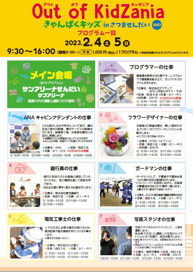 参加方法:専用サイト https://out-of-kidzania-satsumasendai.com/ より事前予約