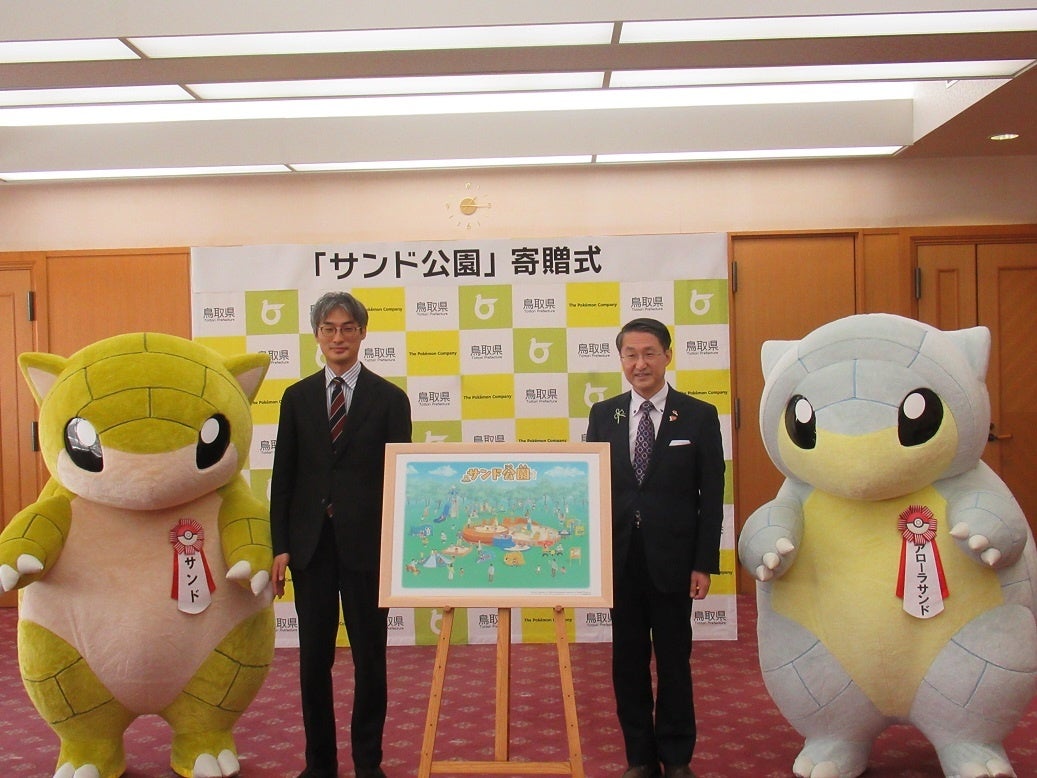 サンドの日である3月10日に、平井伸治鳥取県知事と、株式会社ポケモン代表取締役COOの宇都宮崇人氏から、5月5日に開園予定の「サンド公園」の遊具及び周辺設備の寄贈が発表されました。