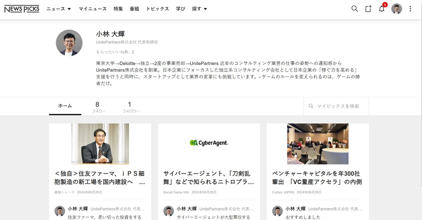 Unite Partners株式会社(本社:東京都品川区)の代表取締役、小林大輝は2024年7月、ソーシャル経済メディア「NewsPicks」のプロピッカーに就任しました。