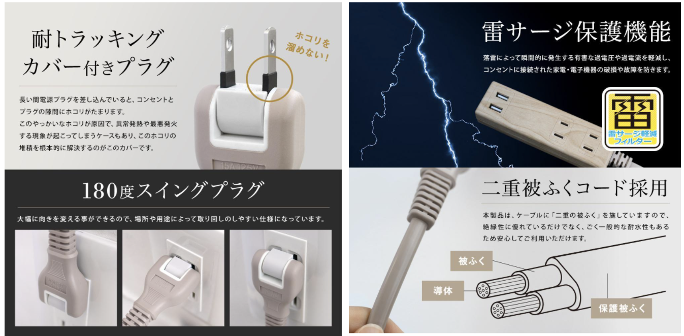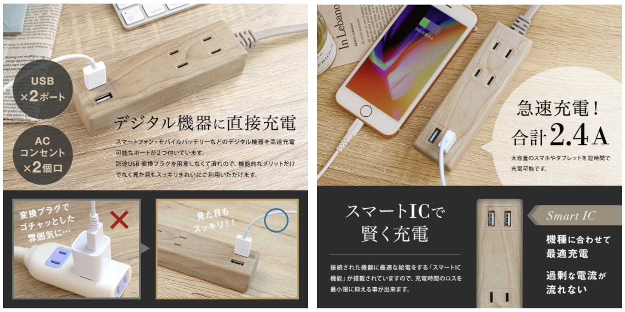 本製品は急速充電対応のUSBポートを搭載したOAタップです。優しい木目調で、インテリアに馴染みやすいデザインに仕上げました。一般的な白黒のOAタップはインテリアに浮いてしまいがちですが、おしゃれなインテリアにも馴染むOAタップとして開発しました。