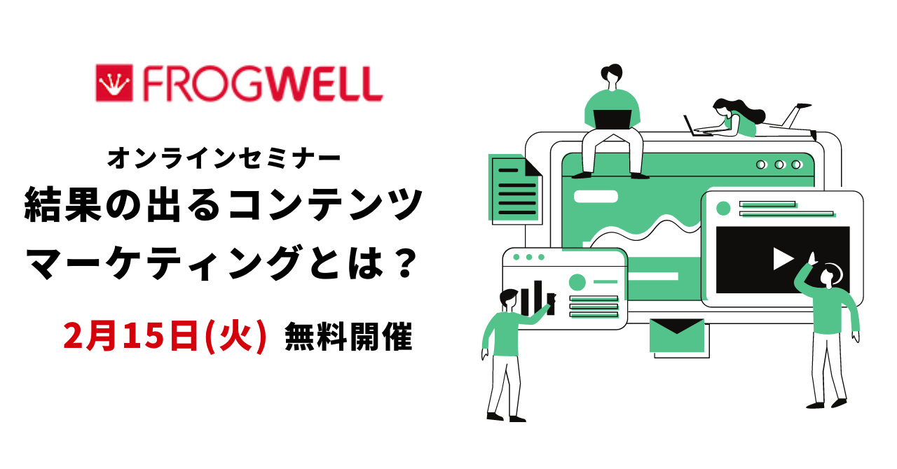 データ・プロセスのコンサルティング及びアウトソーシングサービスを提供しているフロッグウェル株式会社(所在地 : 東京都港区、 代表 : 大田宏之、以下「フロッグウェル」)は、『結果の出るコンテンツマーケティングとは?~1年で0→60万人集めたメディア運営の基本と実践、実際のケースをご紹介~』オンラインセミナーを2月15日(火)に無料開催いたします。