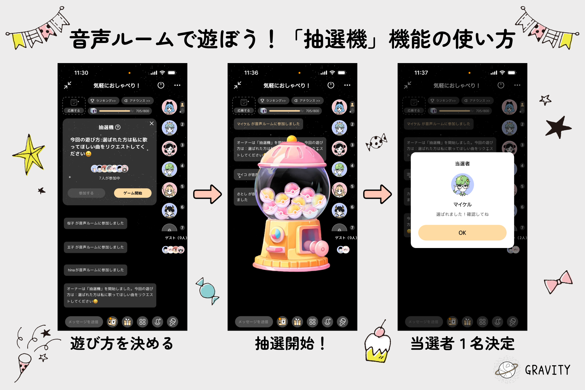 抽選機は、音声ルームのオーナーが他ユーザーの中からランダムに1名を抽選し、一緒にゲームをする機能です。※音声ルームの中でのみ利用可能。