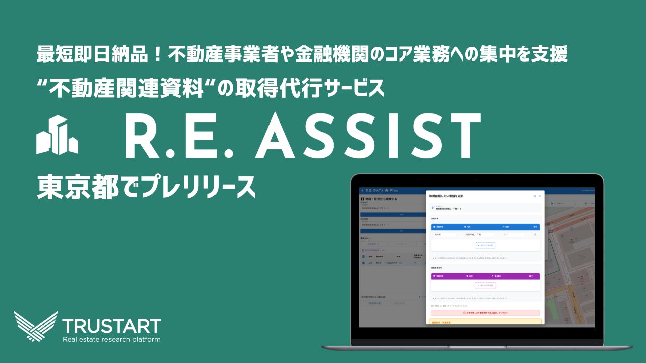 AI×不動産ビッグデータで不動産関連業務のDX化を伴走支援するプラットフォーム「R.E.DATA (リデータ)」を開発・提供するTRUSTART株式会社(本社:東京都港区、代表取締役:大江洋治郎、読み:トラスタート、以下「TRUSTART」)は、不動産関連資料の取得を代行する「R.E.ASSIST(リアシスト)」を東京都限定で、プレリリースいたします。
