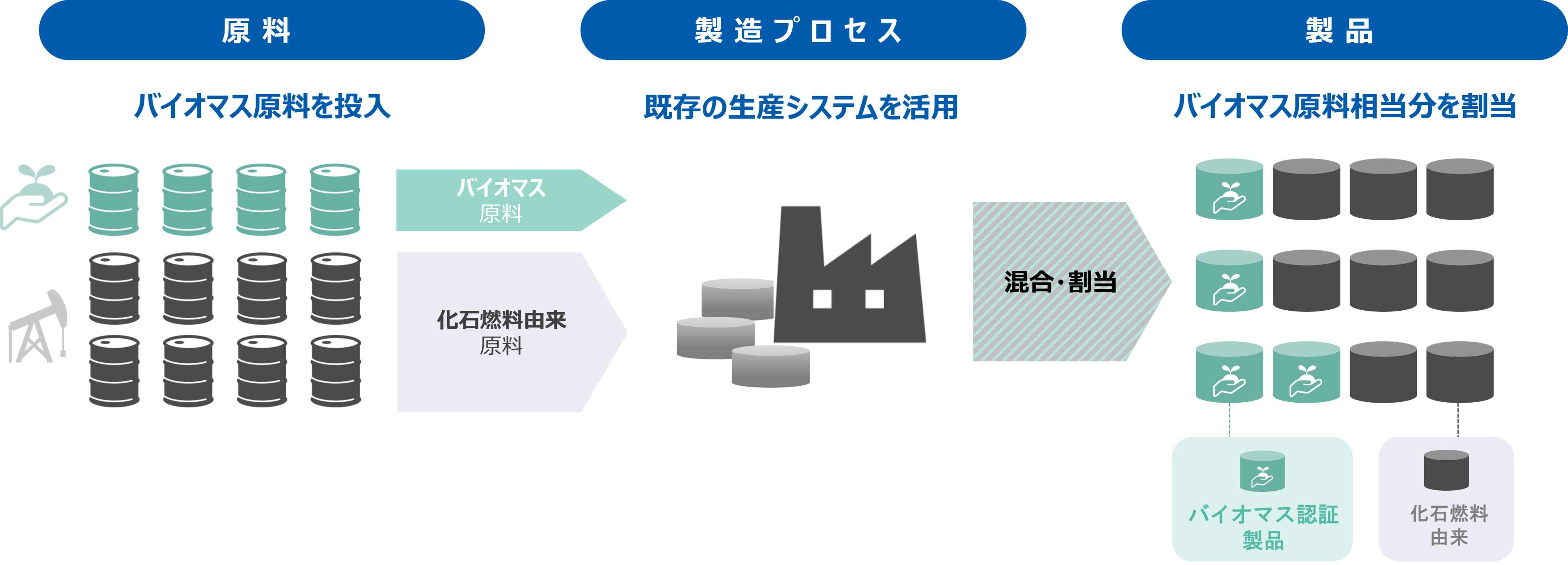 複数の種類の原料(例:バイオマス原料等と化石燃料由来の原料など)により製品を製造した際に、特定の材料(例:バイオマス原料等)の投入量に応じ、製品の一部にその特性全てを割り当てる方式。ISCC PLUSシステムで採用されている管理方式です。