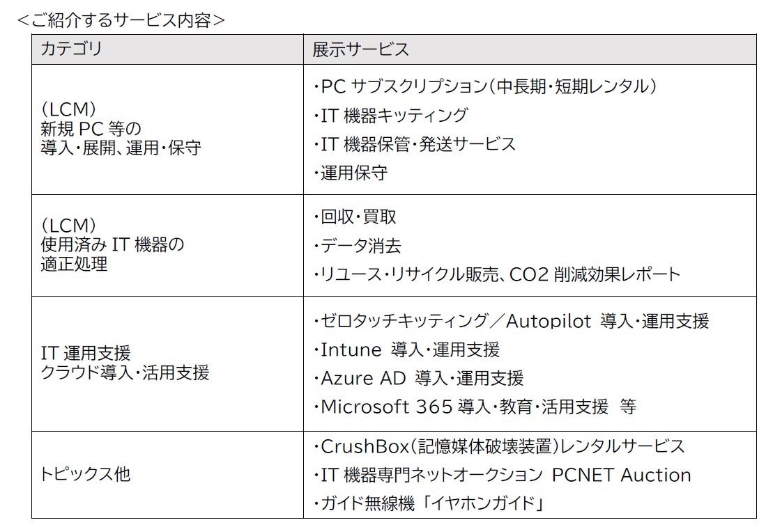 今回の展示会におきましては、「情報システム部門の業務負荷軽減」、「使用済みIT 機器の適正処理」を主なテーマとして、情報システム部門の「困った」をまるっと解決する、LCM(※2)サービスをご紹介いたします。