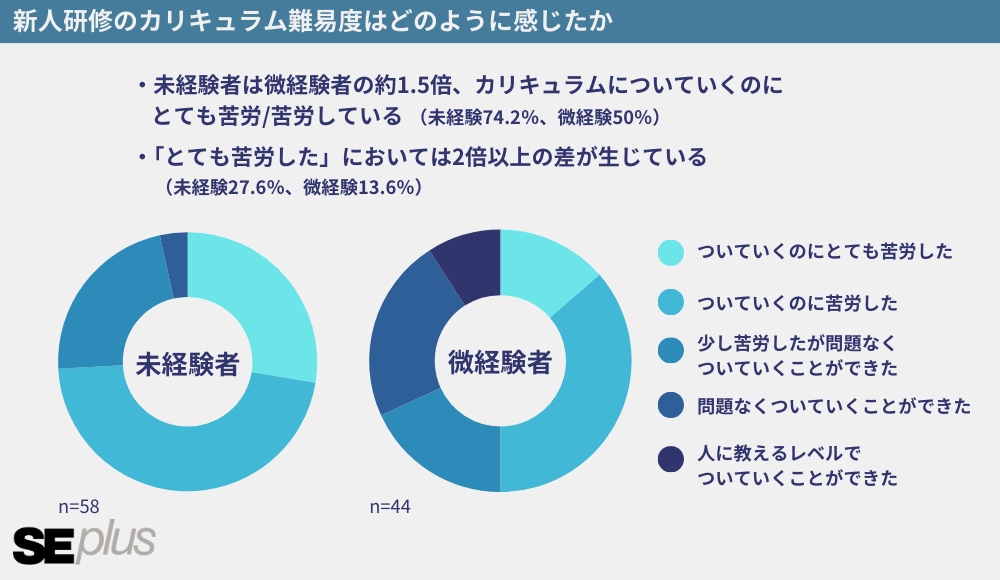 実際に全くの未経験者と、入社までに少しでもITの経験がある微経験者とでは、研修の難易度について感じ方に大きな開きが生まれています。