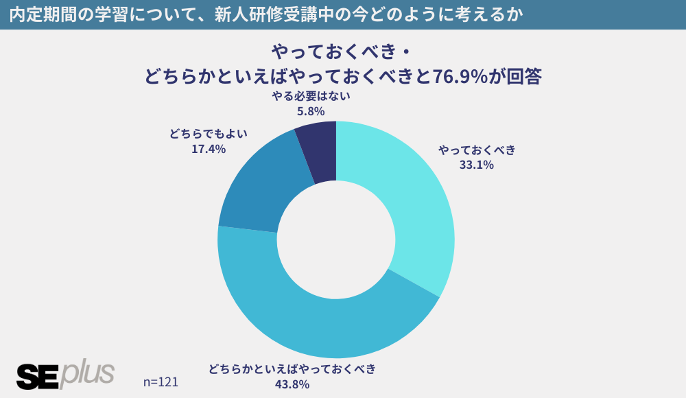 やっておくべき33.1%、どちらかといえばやっておくべき43.8%と、合計76.9%と8割近くの新人が内定期間中の学習はやっておくべきだと考えていることが分かりました。