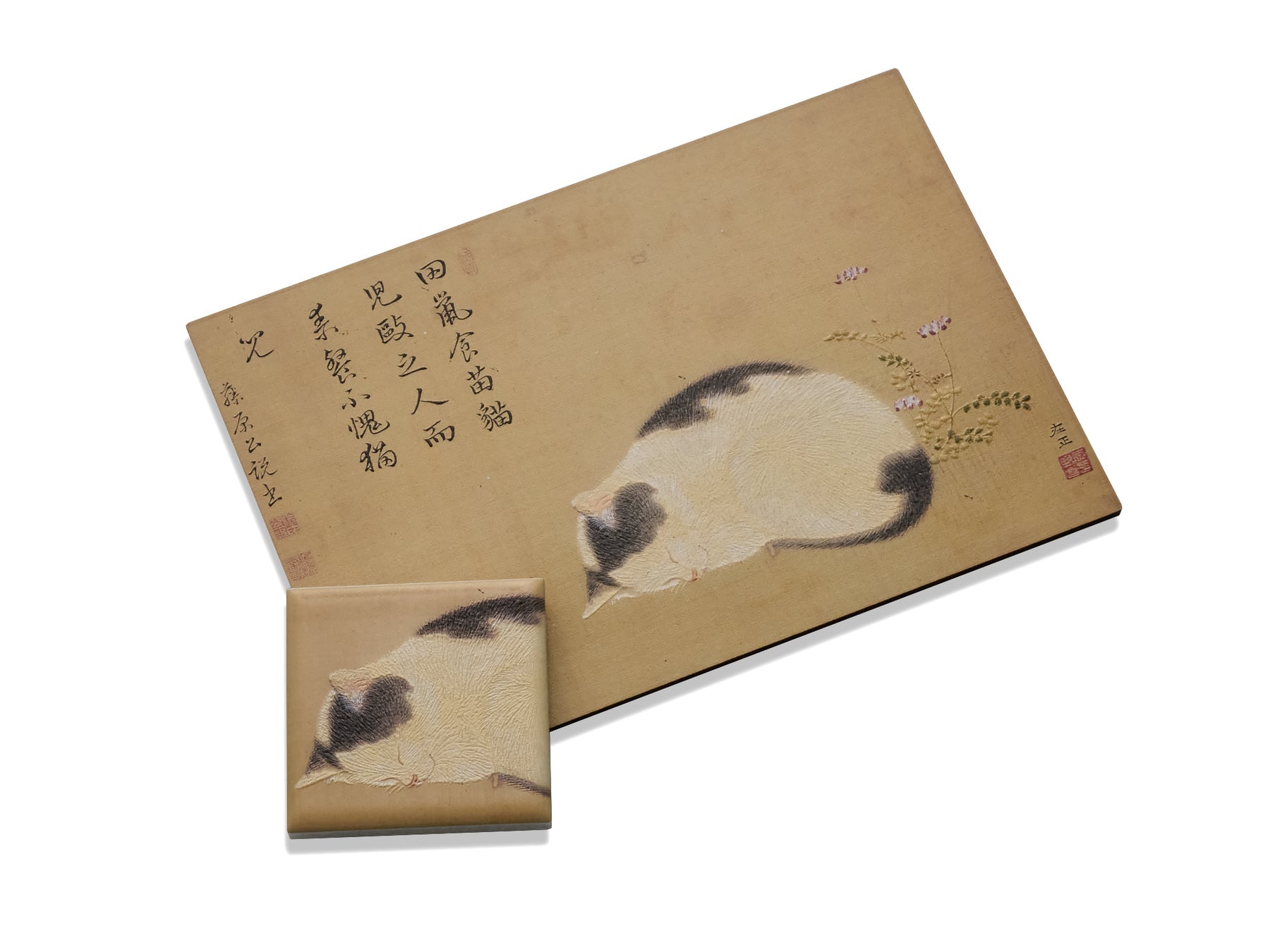 レンゲソウの傍らで丸くなり、気持ちよさそうに眠る猫が描かれている作品です。しなやかな筆運びで表現されている猫の柔らかな毛並みや、しなやかなフォルムに緻密な凹凸を加え、立体的にアレンジしました。まるで今にも動き出しそうなほどの存在感を放ちながらも、日本画が持つ静謐で詩的な雰囲気をそのまま閉じ込めた特別なアイテムです。