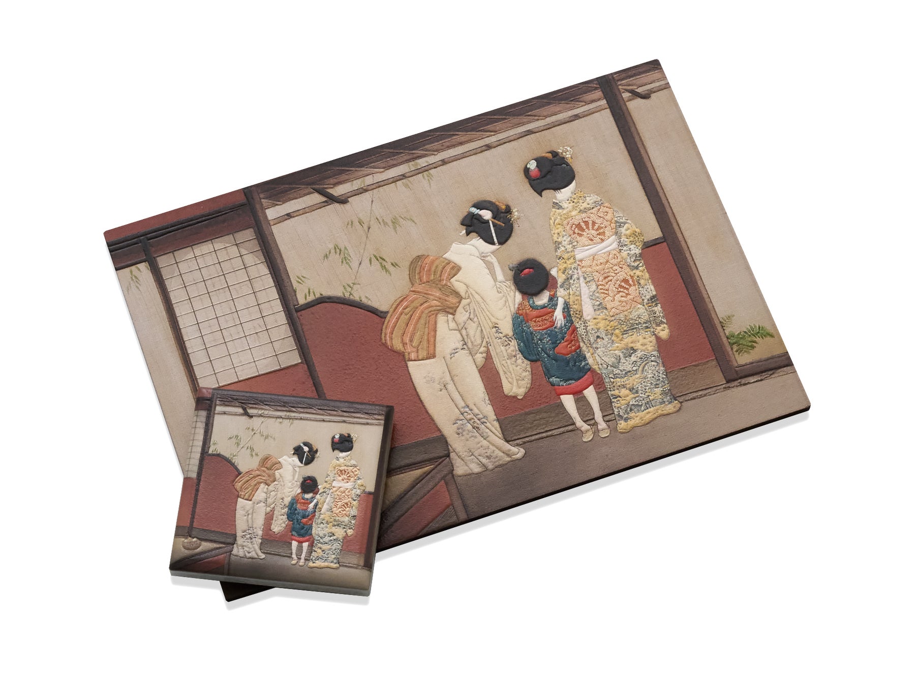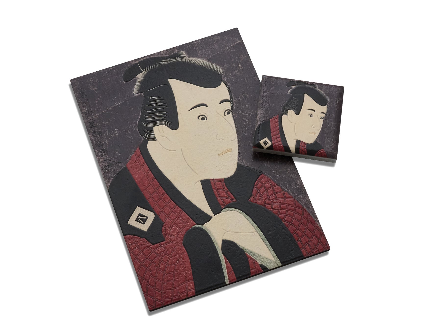 特徴的な役者絵で一世を風靡した四大浮世絵師のひとり、東洲斎写楽の名作です。着物の柄や髪の細かな線でくっきりとした凹凸を加え、平面的な浮世絵にメリハリを持たせています。肌の部分や背景も、木版画特有の質感を再現することで、手触り感が出るようにアレンジしました。光を当てると、人物が背景からふわりと浮かび上がるような視覚効果を生み出しています。