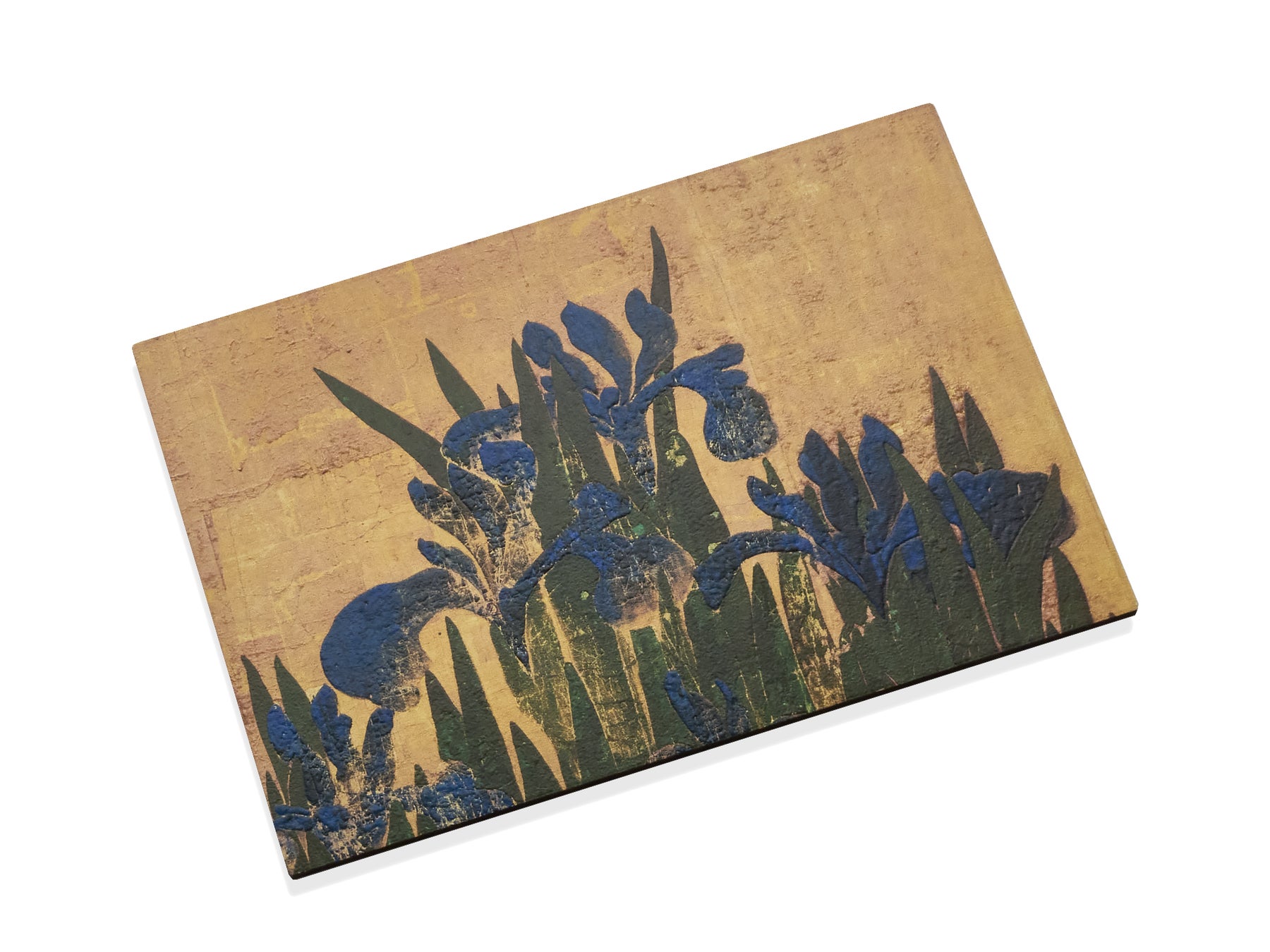 金地の屏風いっぱいに燕子花(カキツバタ)の群落が咲き誇る、江戸中期の絵師・尾形光琳の代表作です。群青の花と緑青の葉の濃淡を忠実に再現し、花弁の膨らみには丸みのある凹凸を施すことで、芳醇な香りがただよう花々の表情を立体的に表現しました。金地の背景には和紙特有のざらりとした質感を加えており、金箔の輝きと風合いを味わうことができるポストカードです。