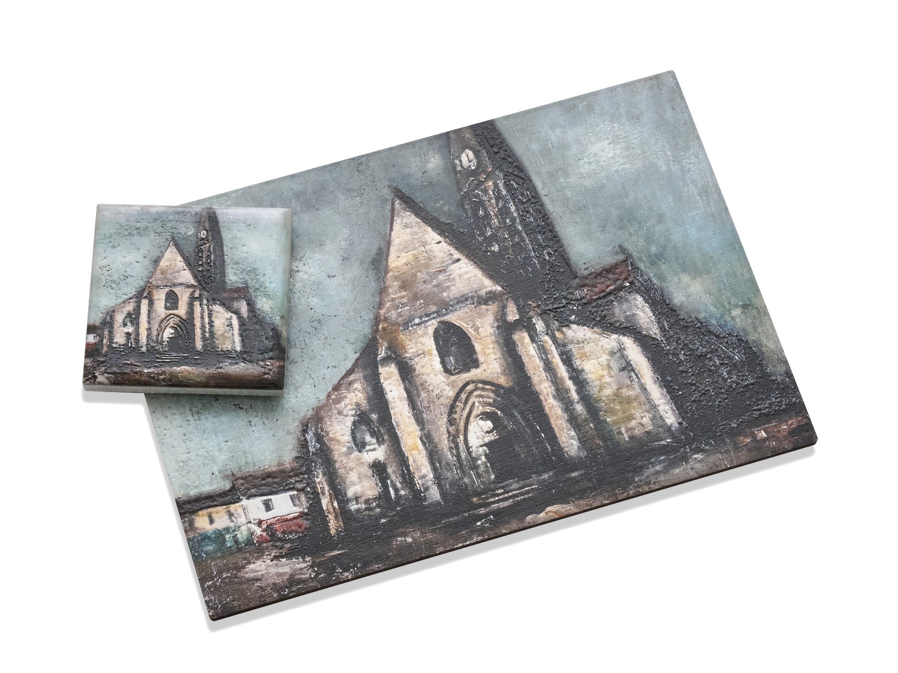 街の風景を多く描いた洋画家、佐伯祐三がパリ郊外の教会を描いた作品です。彼の特徴的な太く力強い筆致を拾い上げ、その強弱に合わせた大胆な凹凸を加えることで、厳かな教会の存在感を立体的に表現しました。背景に広がる空にも筆跡の凹凸を施すことで、どこか不安定さと重みを感じさせる、作品全体に漂う独特な空気感をそのままアイテムに落とし込みました。