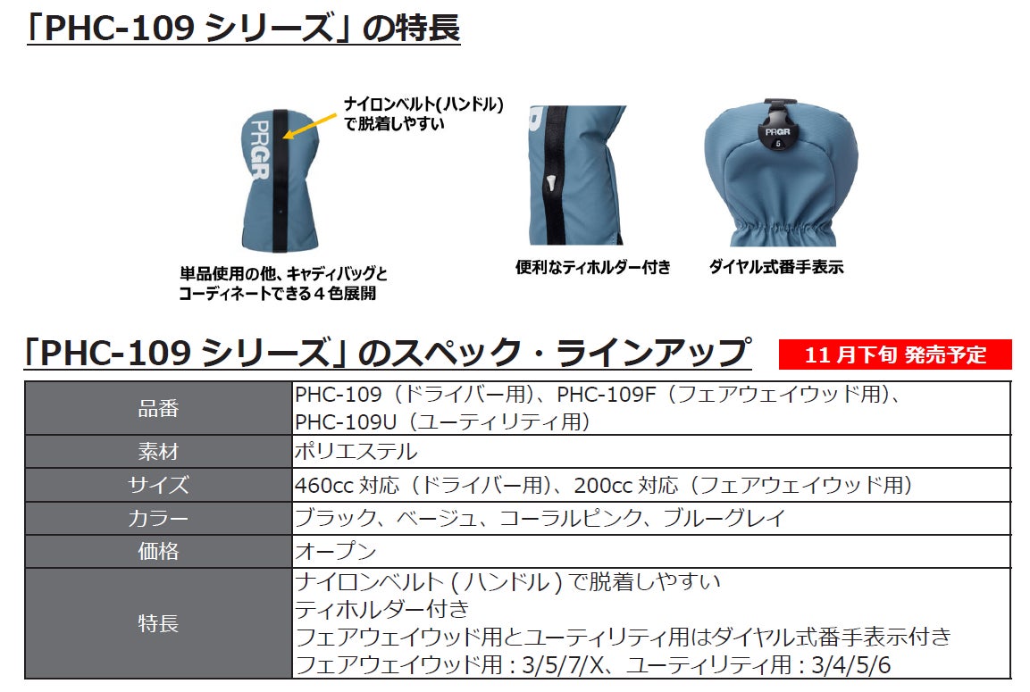 (株)プロギアは、飽きのこないシンプルなデザインと使いやすさを追求したカジュアルなキャディバッグとヘッドカバーを10月から順次発売します。キャディバッグは軽量なスタンドタイプ「PCB-109」とシンプルデザインのカートキャディバッグ「PCB-110」の2種類。ヘッドカバーはキャディバッグと同じ生地の「PHC-109シリーズ」「PHC-110シリーズ」の2種類をラインアップします。