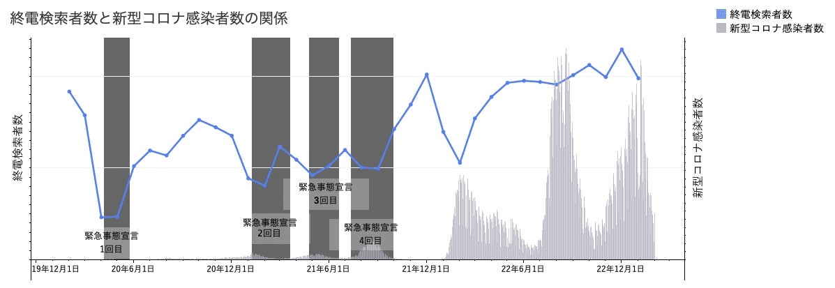 「Yahoo!乗換案内」アプリでは、指定したルートの終電を検索できる機能を提供しています。この終電検索のデータから、まずはコロナ禍における終電検索者数の推移と、新型コロナ感染状況の関係を調査しました。