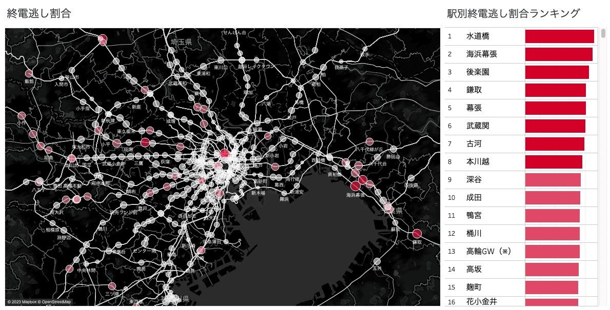 単純に終電検索者数が多い駅(出発駅指定された駅)を調べると、「新宿」「渋谷」「東京」など、路線数が多い主要駅が上位にランクインしています。一方、終電の出発時刻以降に終電を検索した状況を“終電逃し”と推定し、終電検索者に占める“終電逃し”割合を分析すると、“終電逃し”割合が高い駅の1位に「水道橋」、3位に「後楽園」と東京ドームの最寄り駅が上位にランクインしました。東京ドームでの各種イベントに参加し、終了するまで参加した結果、終電を逃してしまうケースが多かったものと推測されます。その他には「海浜幕張」「古河」「本川越」など、路線の終着駅となり得る駅がランクインし、電車内で寝過ごして終着駅まで来てしまい終電が無くなってしまった…といった状況が想像できる結果となりました。