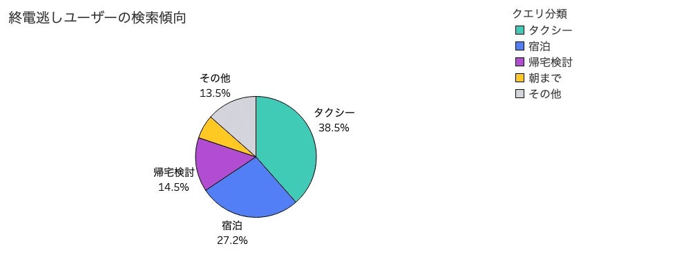 検索者数が最も多かったのが「タクシー」(38.5%)で、駅前にタクシーが見当たらずタクシー会社への連絡などを検討していることがうかがえます。次に多いのが「宿泊」(27.2%)で、「ホテル 格安」「ネットカフェ」などが検索されていました。「帰宅検討(タクシー以外)」(14.5%)は、「路線図」を検索して他のルートで、「深夜バス」を検索して深夜バスで、自宅近くまで帰宅可能かを調べる様子が想像されます。「朝まで」(6.3%)は、帰宅も宿泊も諦めて、朝まで開いている居酒屋やカラオケなどを探す検索行動と捉えられる結果となりました。