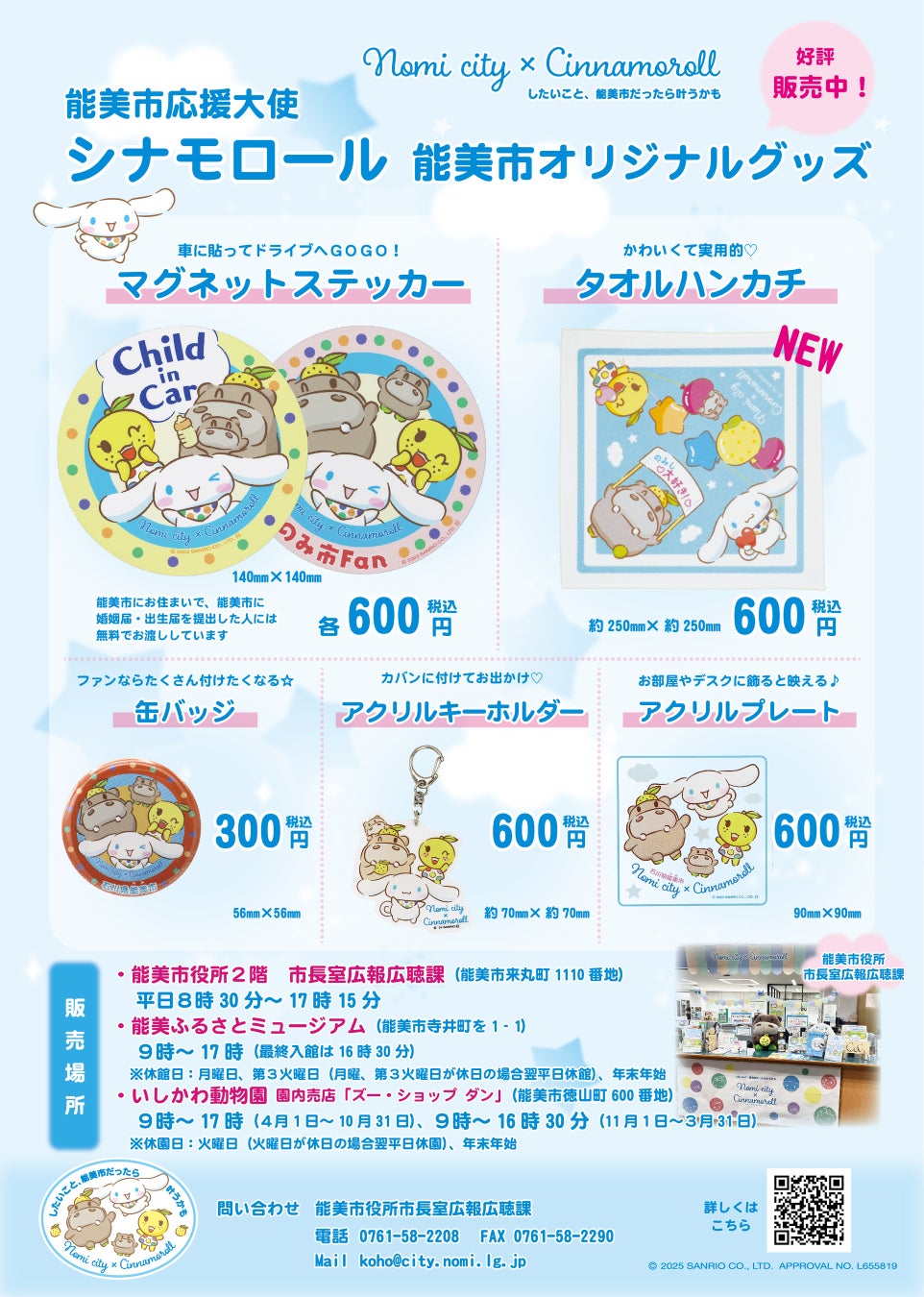 能美市誕生20周年を記念して、市応援大使「シナモロール」と市公式キャラクター「ひぽ能ん・ゆず美ん・ぽぽ能ん」のタオルハンカチを制作しました。2025年5月8日(木曜日)から能美市内で販売を開始します。