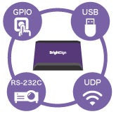 RS-232C、USB、GPIO、UDPで外部機器と接続し、双方向のコントロールが可能です。センサー等を併用することで、インタラクティブサイネージを簡単に実現できます。