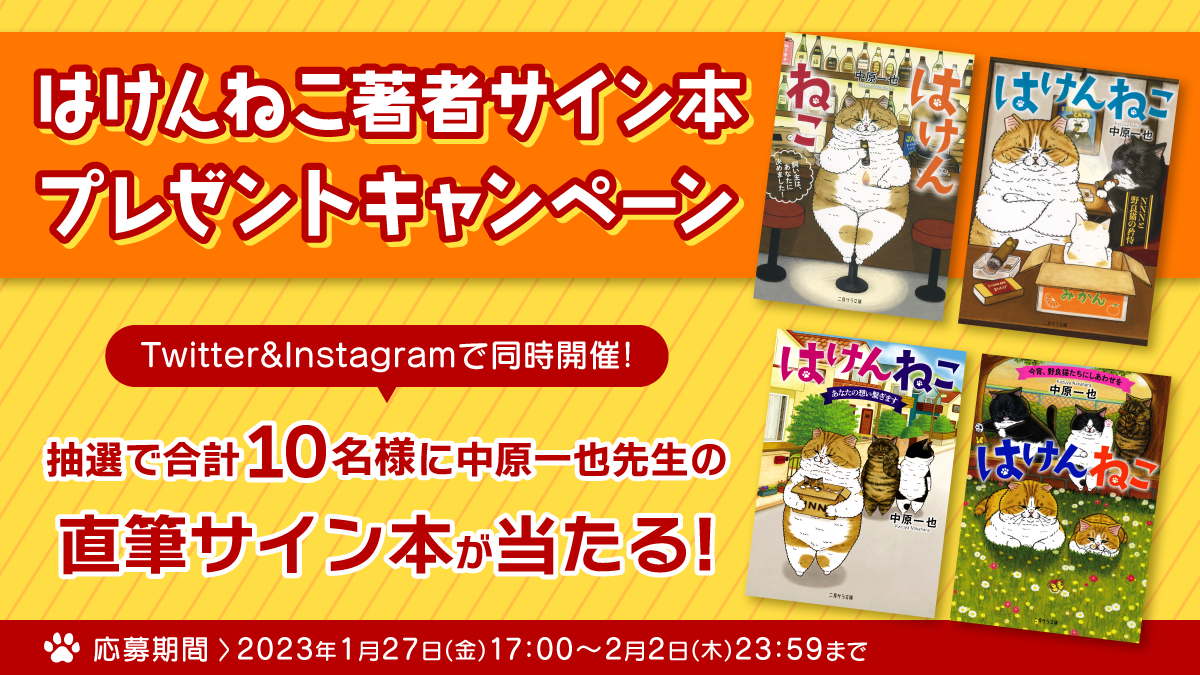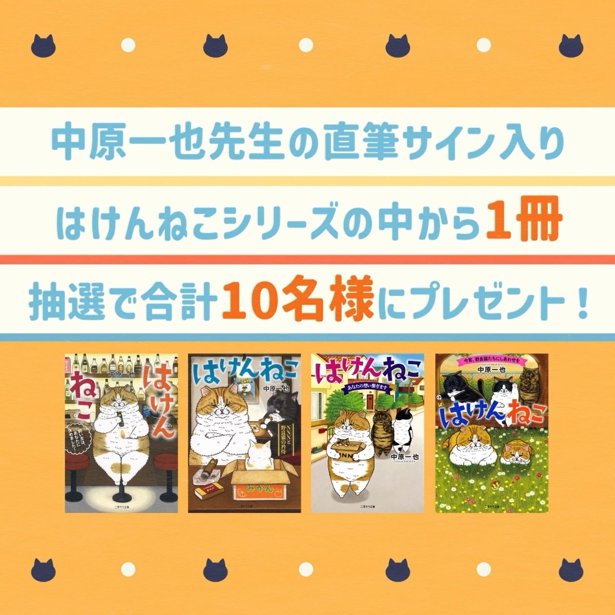 こちらを記念して、二見書房公式TwitterとInstagramアカウントにて『はけんねこ』の著者・中原一也先生のサイン本が抽選で合計10名様に当たるプレゼントキャンペーンを開催いたします。