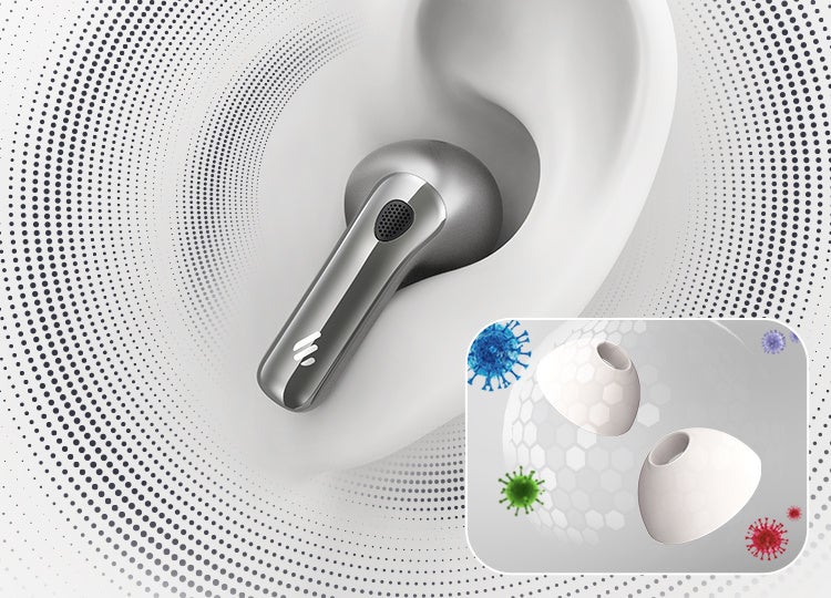 「EvoBuds」は軽量ボディと人間工学に基づいたデザイン、柔らかい抗菌イヤーチップにより、一 日中装着しても圧迫感なく快適にお使いいただけます。