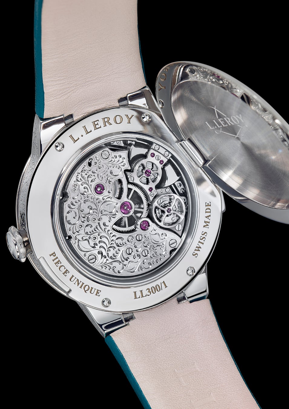 手巻きムーブメントは321の部品で構成され、2本のゴングを備えたミニッツリピーターとフライングトゥールビヨンを駆動。3Hzで振動し90時間のパワーリザーブを実現し、L.Leroyの精密技術と芸術性の両面における卓越性を示しています。