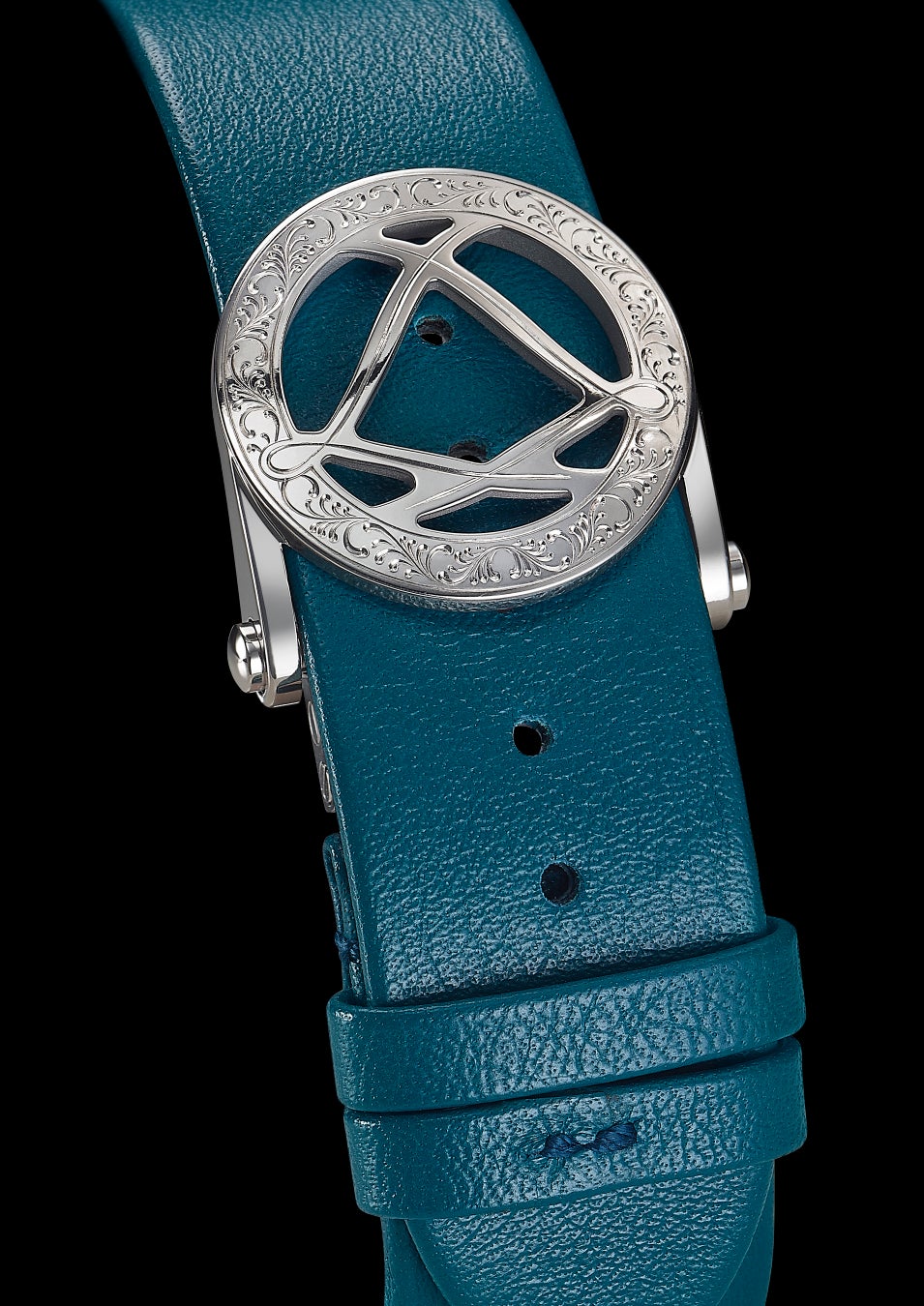 柔らかなアクアマリンカラーのカーフスキンストラップと、ダブル「L」ロゴが刻印された透かし彫りのフォールディングクラスプを備えたこの唯一無二の時計は、メゾンの革新性、歴史、そして高級時計製造技術の永遠の融合を体現しています。