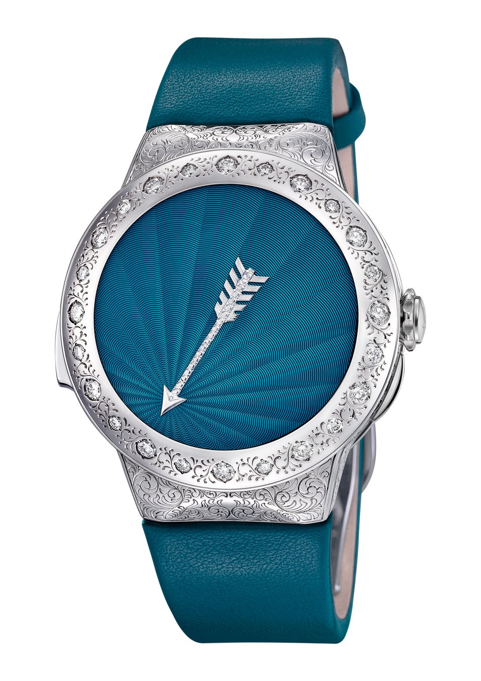 回転式文字盤には、半透明のアクアマリン色ニスを施したフリナック・ソレイユ模様を採用。固定式のロジウムメッキ矢印針は、合計1.35カラットの24個のダイヤモンドを指し示し、整数は大粒、半時は小粒のダイヤモンドで時刻を表示します。