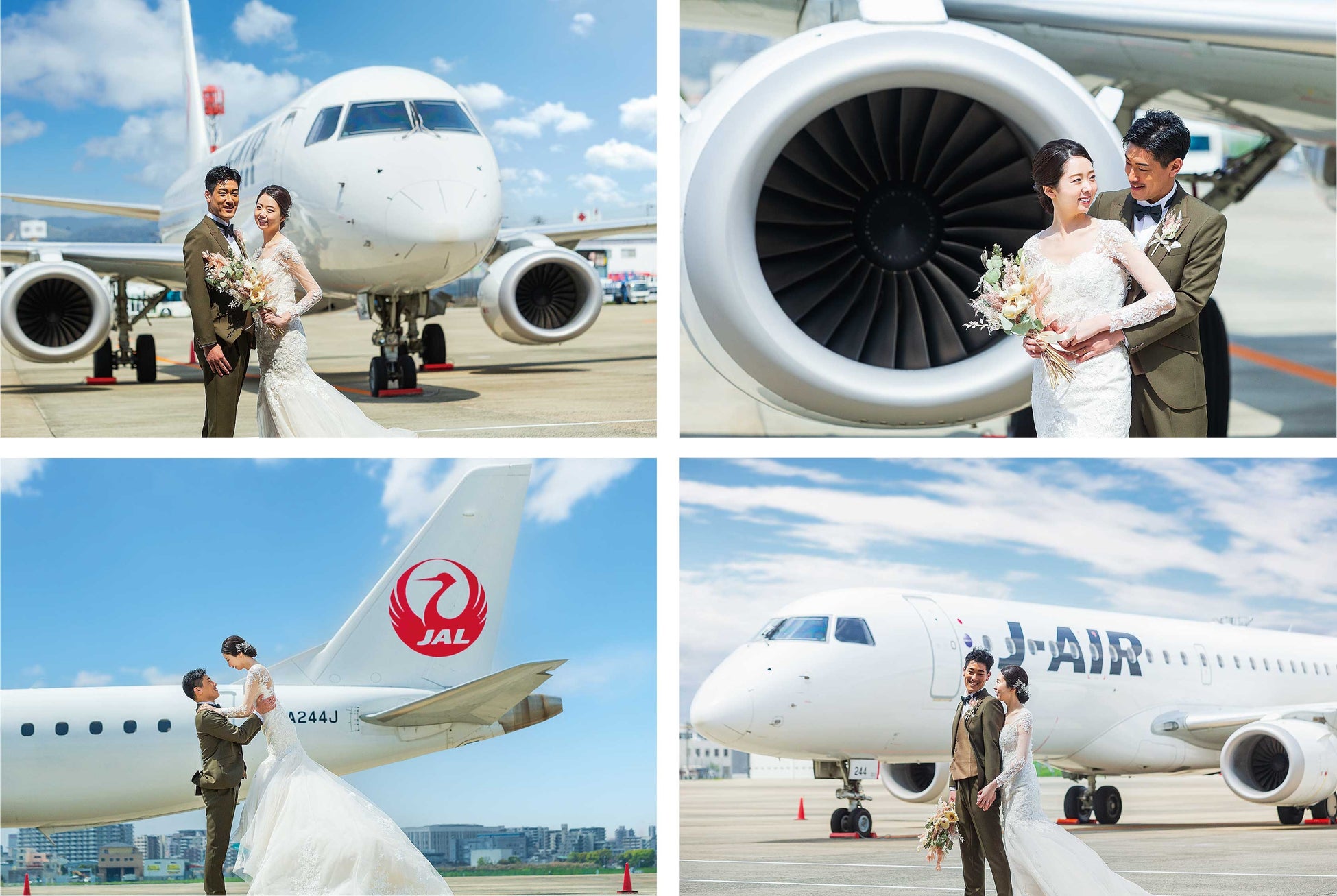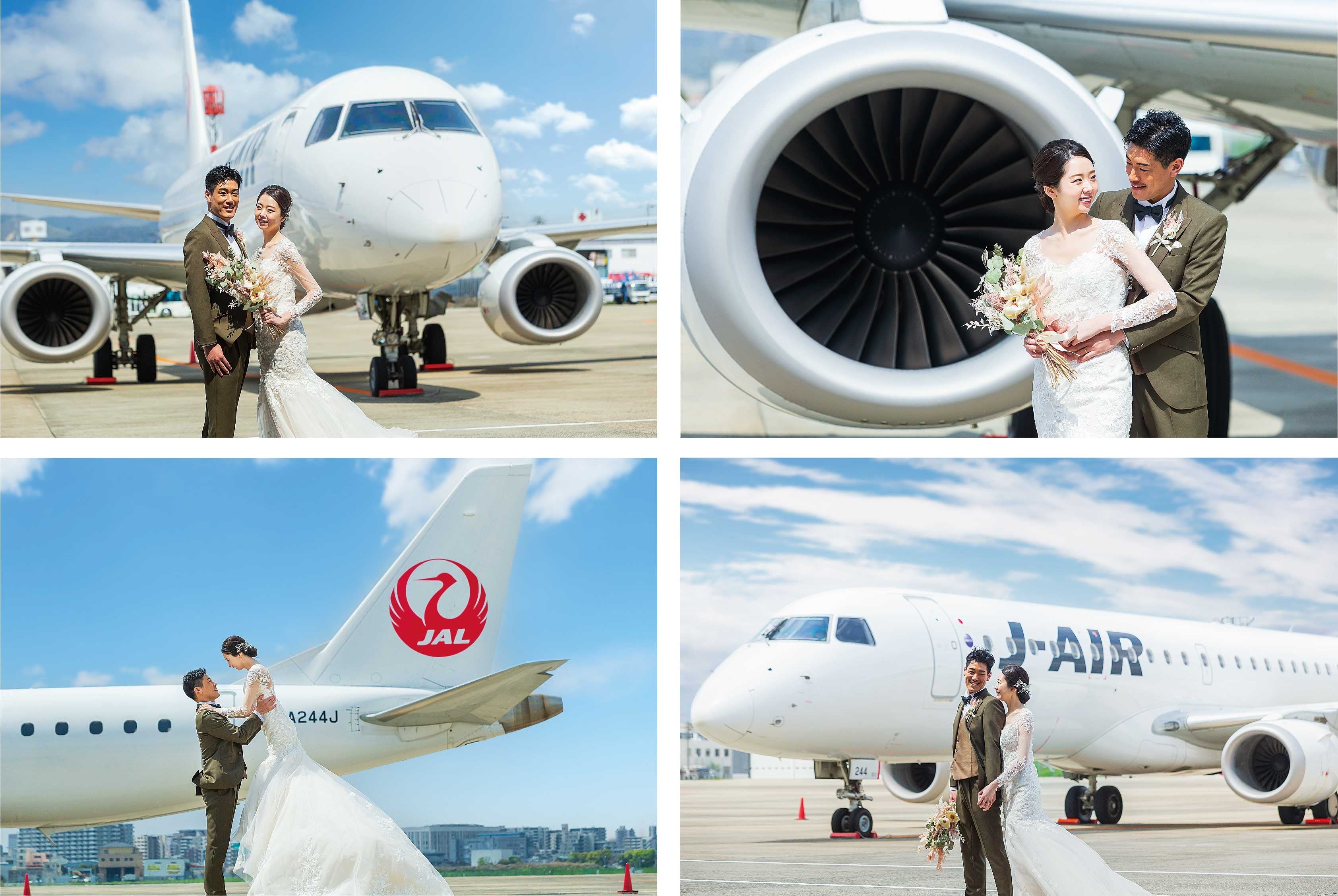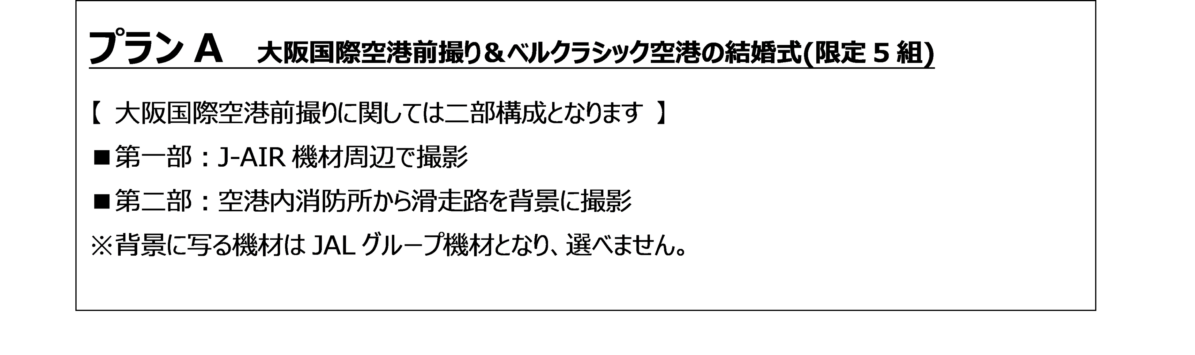 プランA 大阪国際空港前撮り&ベルクラシック空港の結婚式(限定5組) 【 大阪国際空港前撮りに関しては二部構成となります 】 ■第一部:J-AIR機材周辺で撮影 ■第二部:空港内消防所から滑走路を背景に撮影 ※背景に写る機材はJALグループ機材となり、選べません。 |