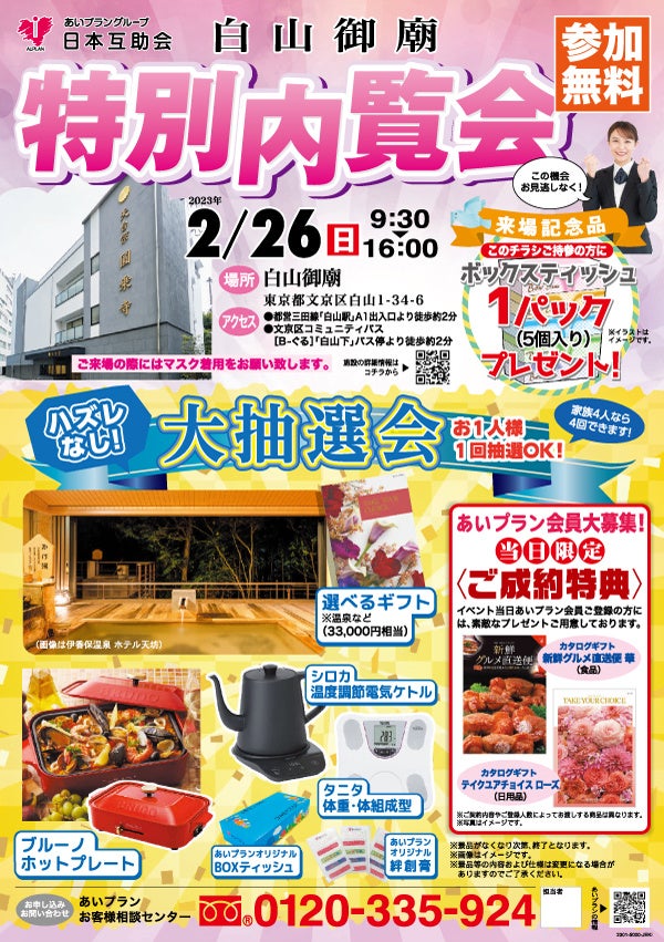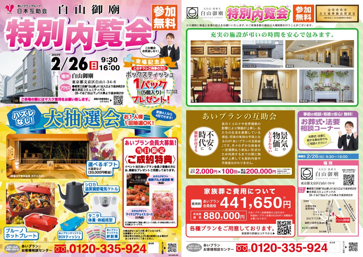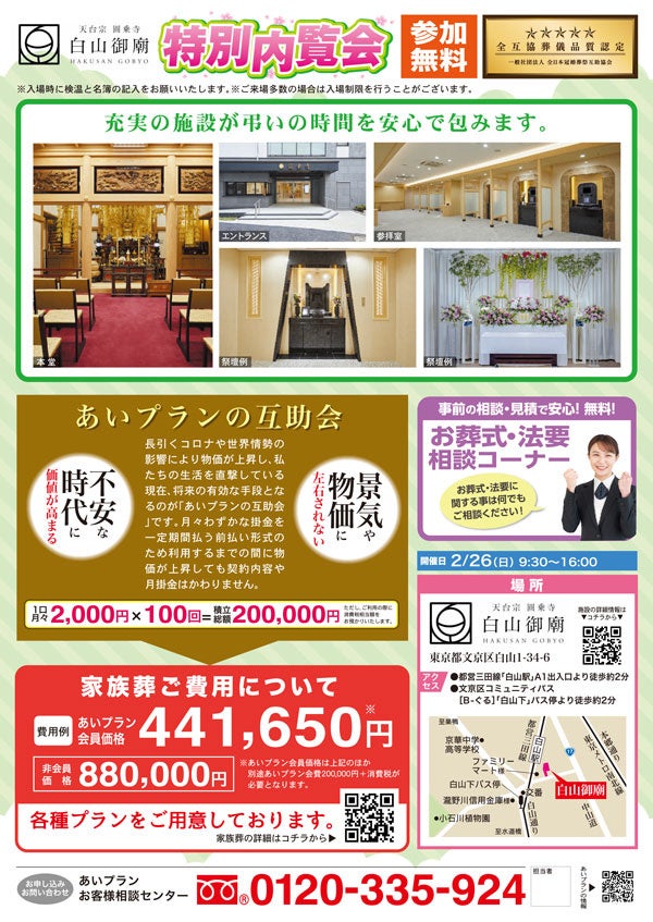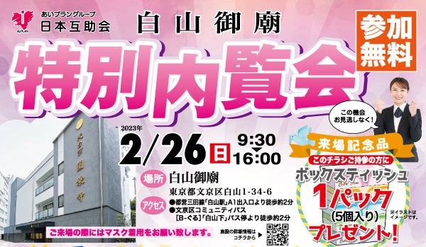 株式会社あいプラングループ(北海道札幌市/代表取締役・新道喜信)の日本霊廟株式会社がご案内している白山御廟 (東京都文京区)で、初めての内覧会を2月26日(日)に開催します。納骨堂の施設をじっくりとご確認いただけるほか、抽選会や葬儀・法要についての相談コーナーも。参加無料