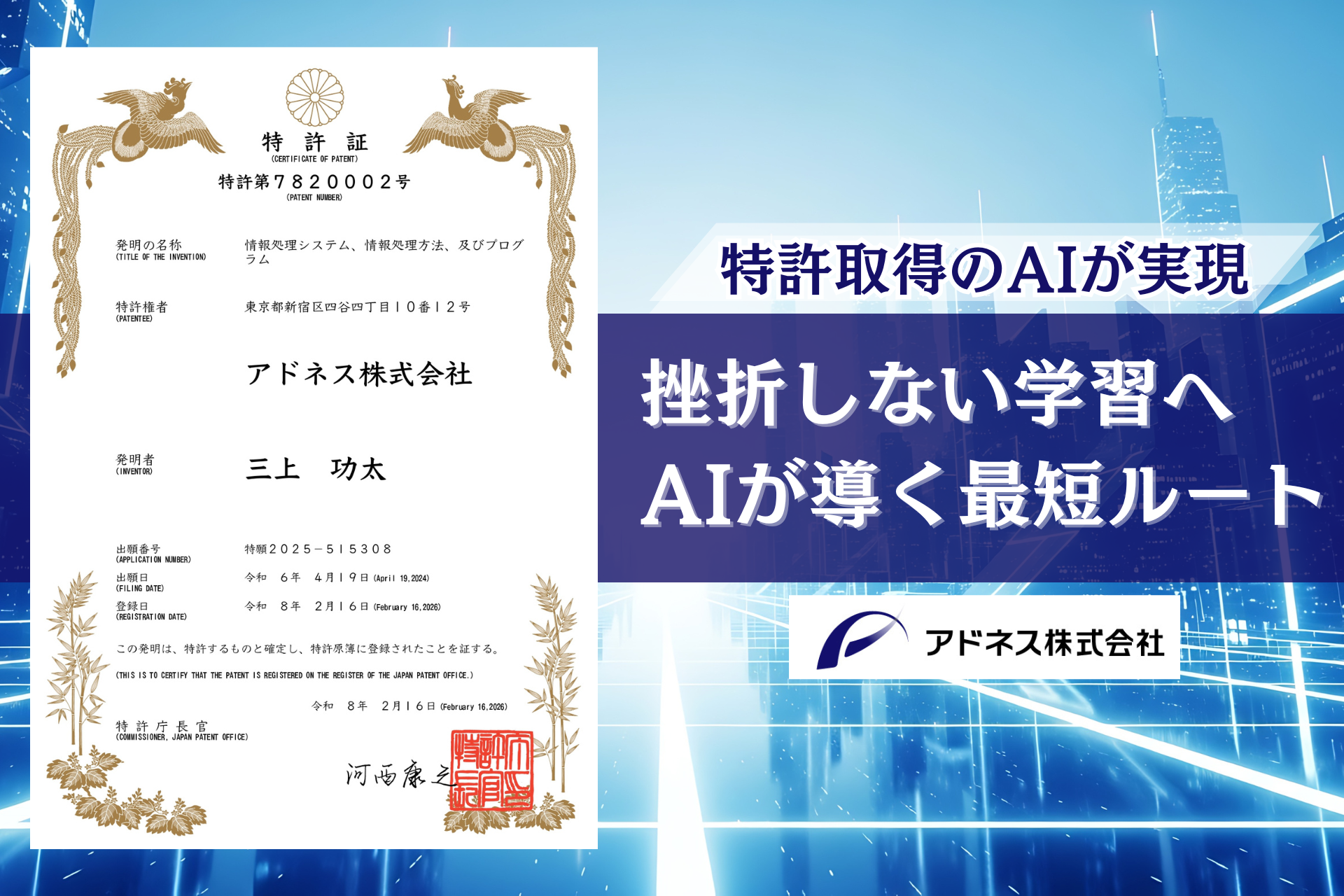 生成AIイノベーションのグローバルリーダー、アドネス株式会社(本社:東京都新宿区四谷、代表取締役社長:三上功太)は、学習者の進捗やつまずきに応じて、工程表(ロードマップ)をAIが自動で最適化・更新する情報処理システムに関する特許(特許第7820002号)を取得したことをお知らせいたします。