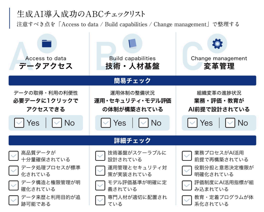 本レポートでは、生成AIが営業部門にもたらす具体的な活用事例や生成AI導入成功のチェックリスト(下図参照)などを用いながら、日本企業が直面する課題を乗り越えるための具体的な道筋を提示します。