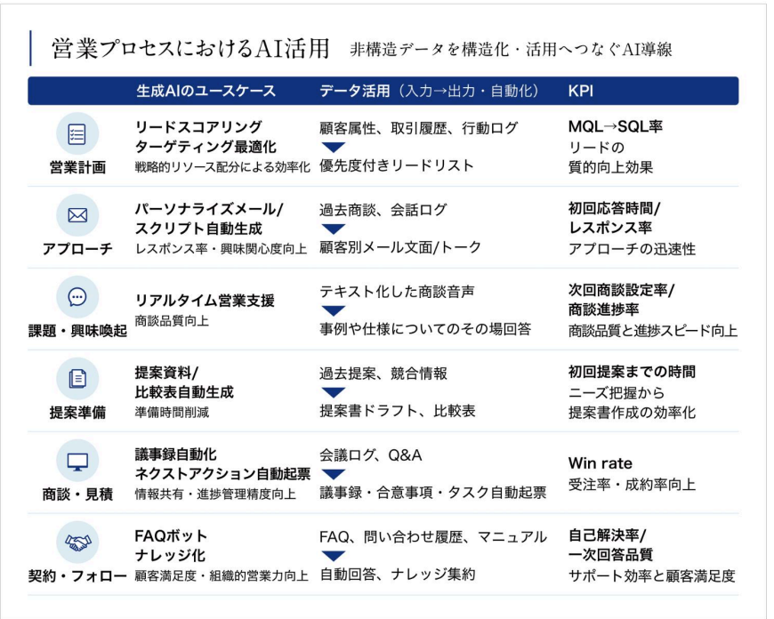 例えば、商談ログなどの「非構造化データ」を活用することで、ネクストアクションの提示や“刺さる”提案資料の自動生成が可能となり、営業担当者が戦略的思考や顧客関係構築といった高付加価値業務に集中できる環境が整いつつあります。