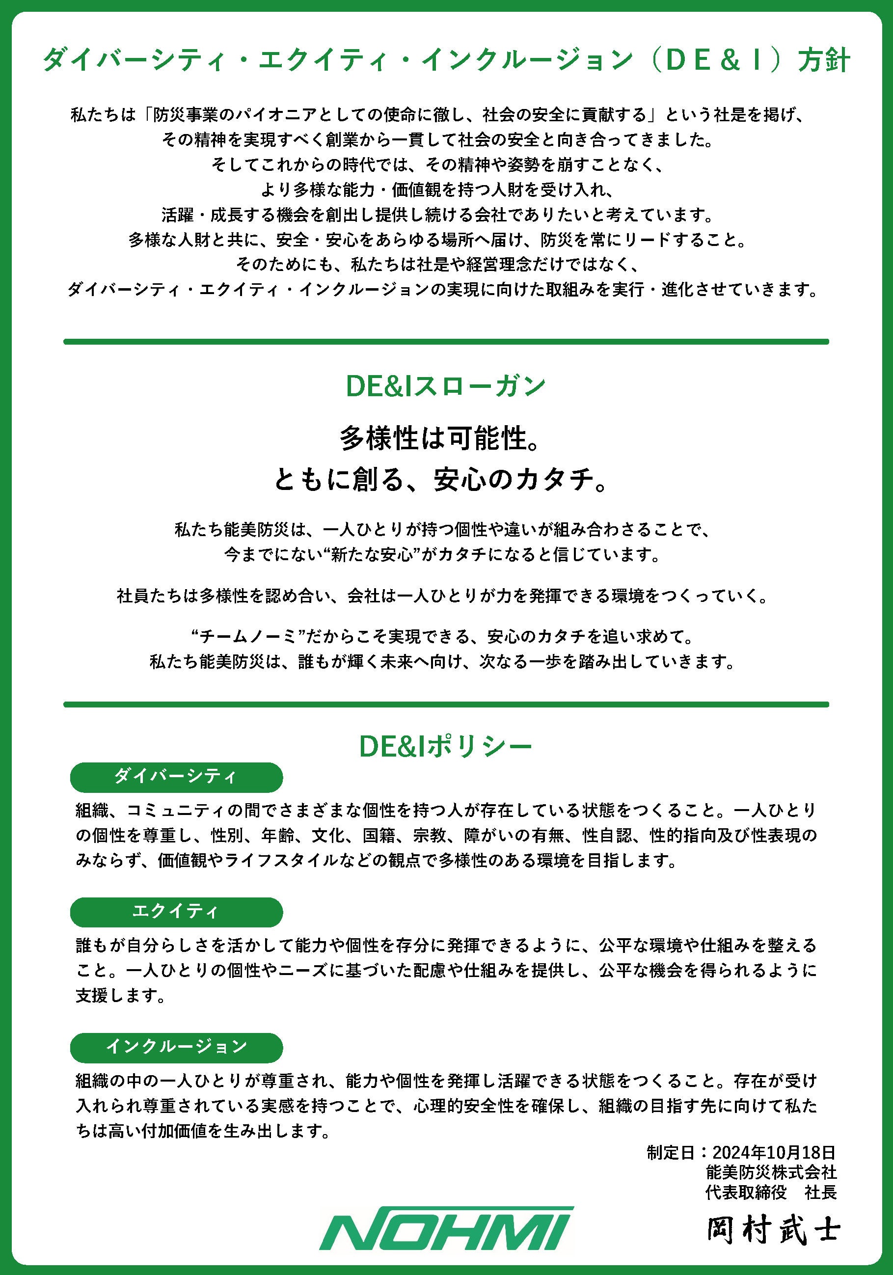 能美防災株式会社は、2024年10月18日に『ダイバーシティ・エクイティ・インクルージョン(DE&I)方針』を制定しました。