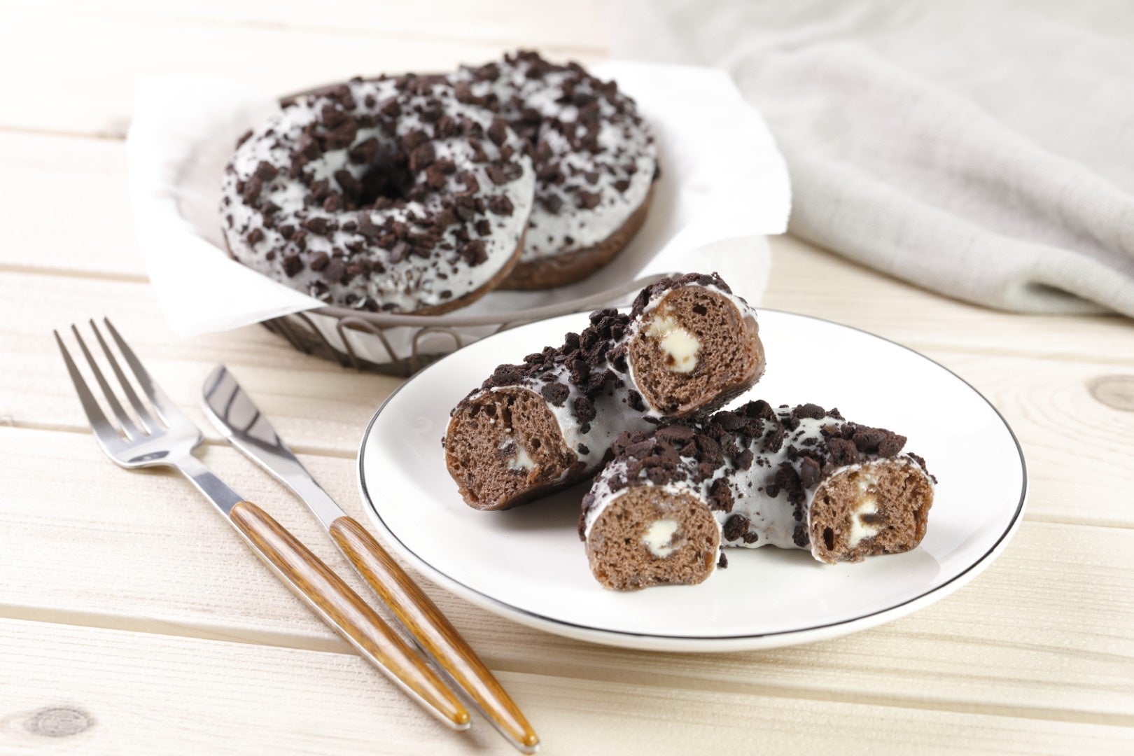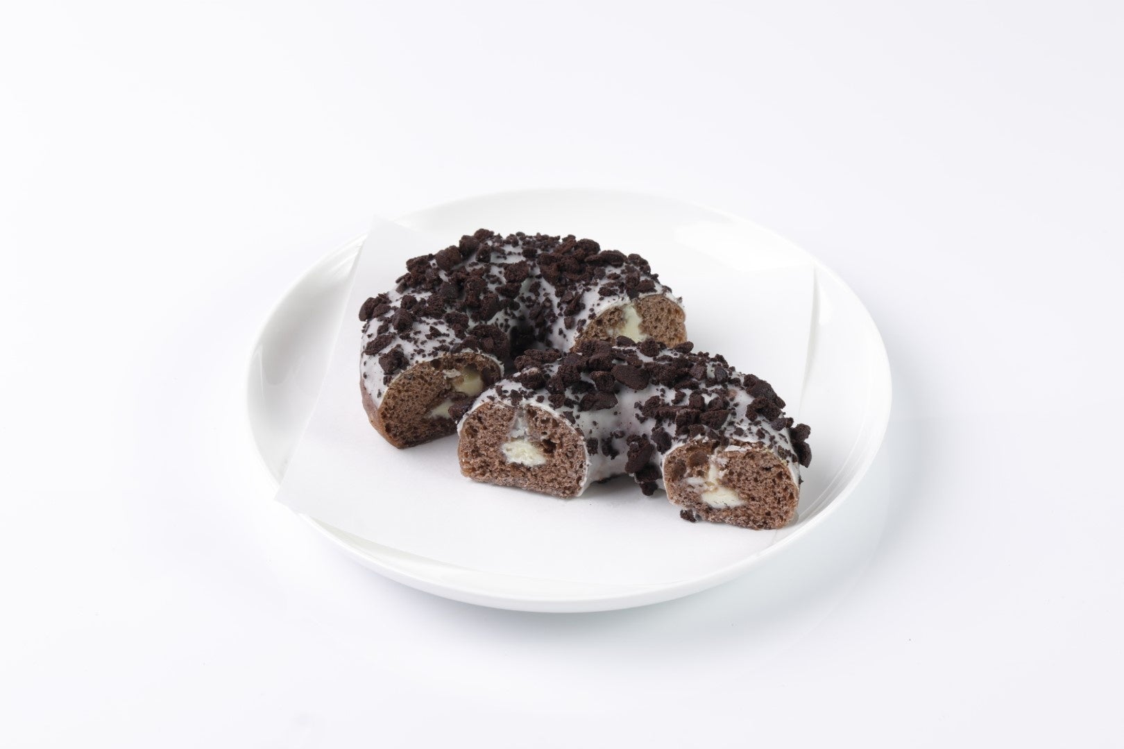 ミルククリームが入ったココア生地のドーナツに、シュガーコーティングを施し、砕いたココアクッキーを贅沢にトッピングしました。