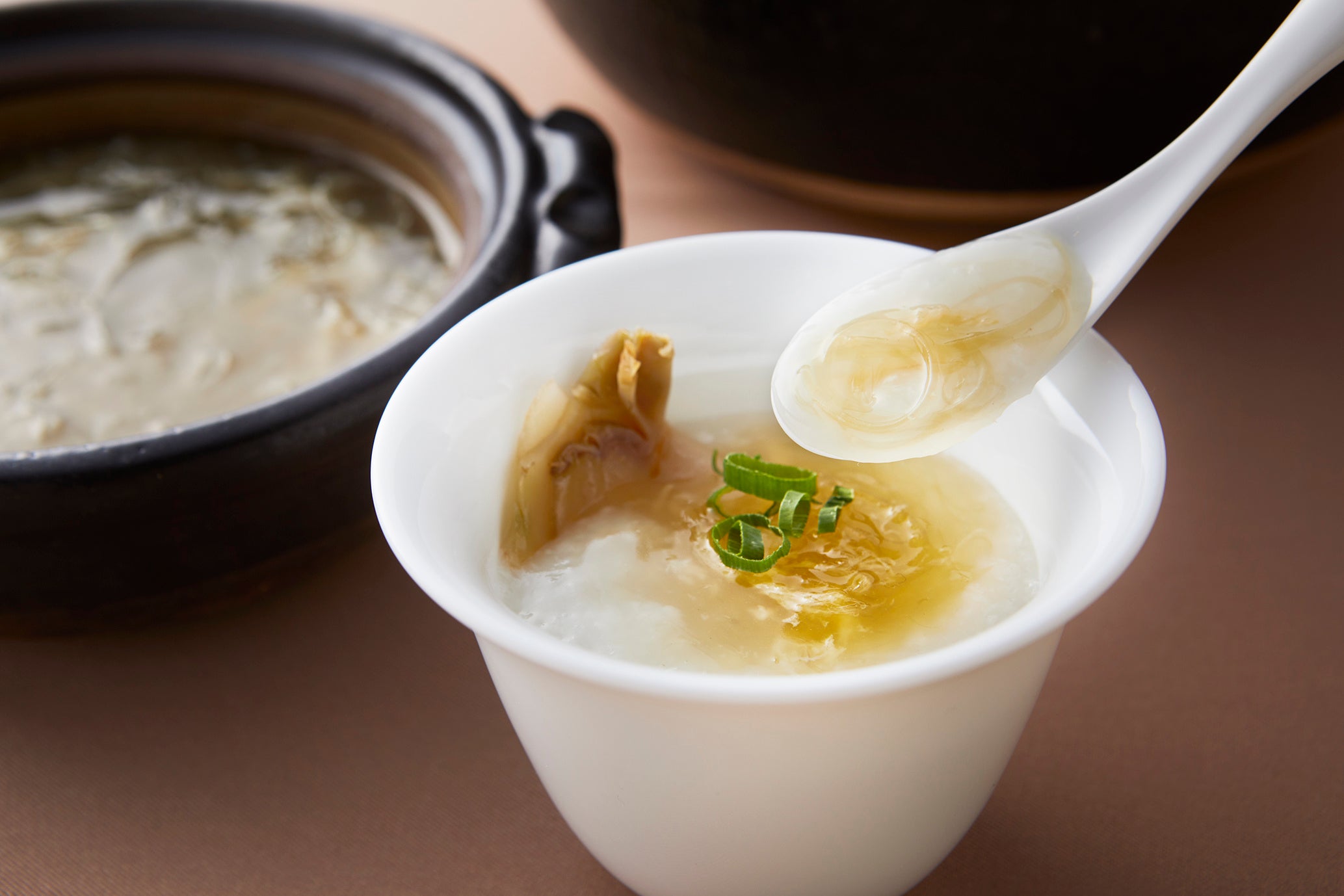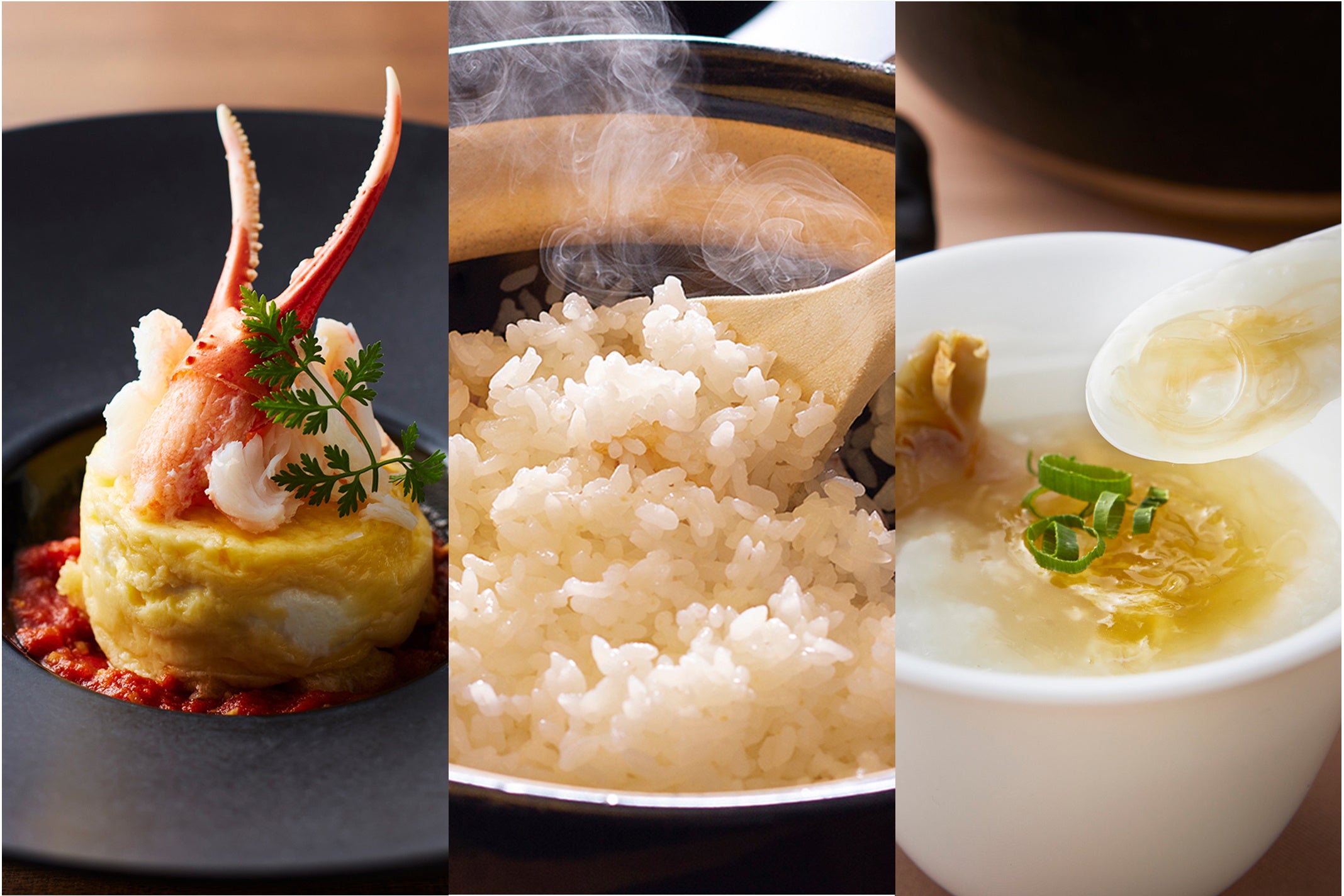 種類豊富な洋食メニューに加え、和食には新潟・南魚沼産こしひかりの土鍋炊き上げご飯、そのお供には佐賀・唐津の自然薯とろろや目の前で焼き上げるだし巻き玉子をお楽しみいただけます。中国料理<南園>で人気の干し貝柱入りの中華粥に、トッピングとしてかけるふかひれ餡もご用意いたします。