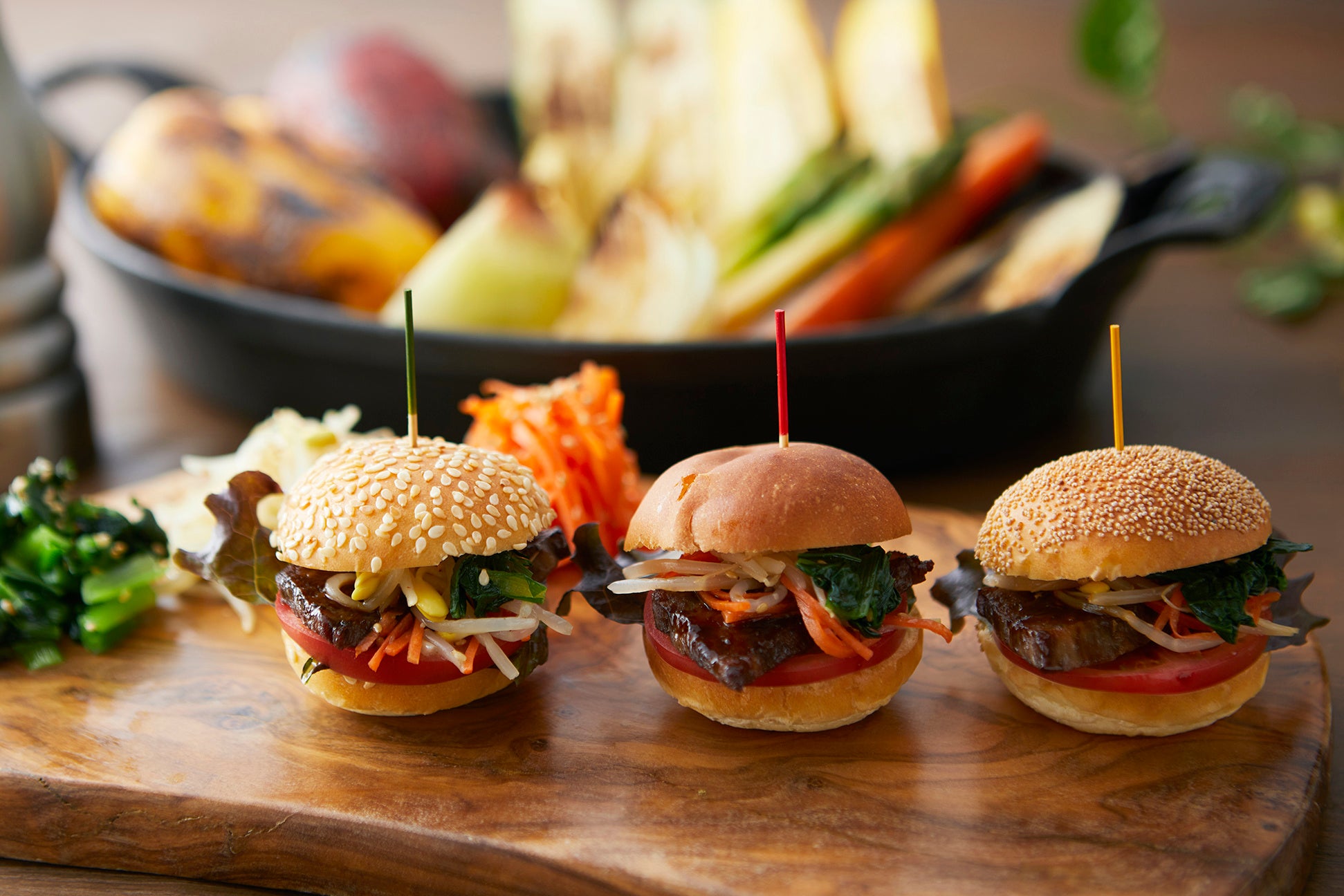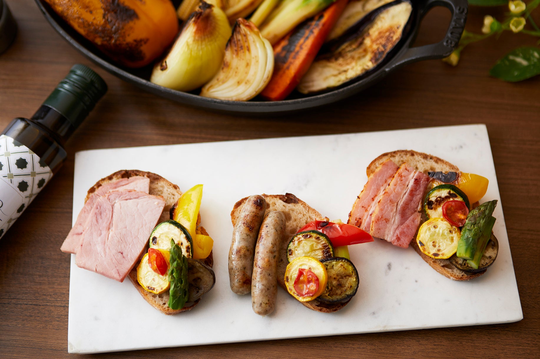 夏に向けた新たなメニューには、暑い季節に食欲がわき、スタミナがつくようにお肉や夏野菜を使用した品々をご用意。国産牛のステーキを特製タレでからめ、野菜のナムルと一緒にホテルメイドのバンズで挟んだ「国産牛スライダーバーガー」や、400℃以上の石窯で焼き上げて美味しさを引き立たせた夏野菜をグリルしたソーセージや厚切りベーコンとともにパン・ド・カンパーニュにのせ、「タルティーヌ」スタイルでお楽しみいただけます。さらに、暑い夏にぴったりな爽やかな「冷製カッペリーニ」もご用意いたします。