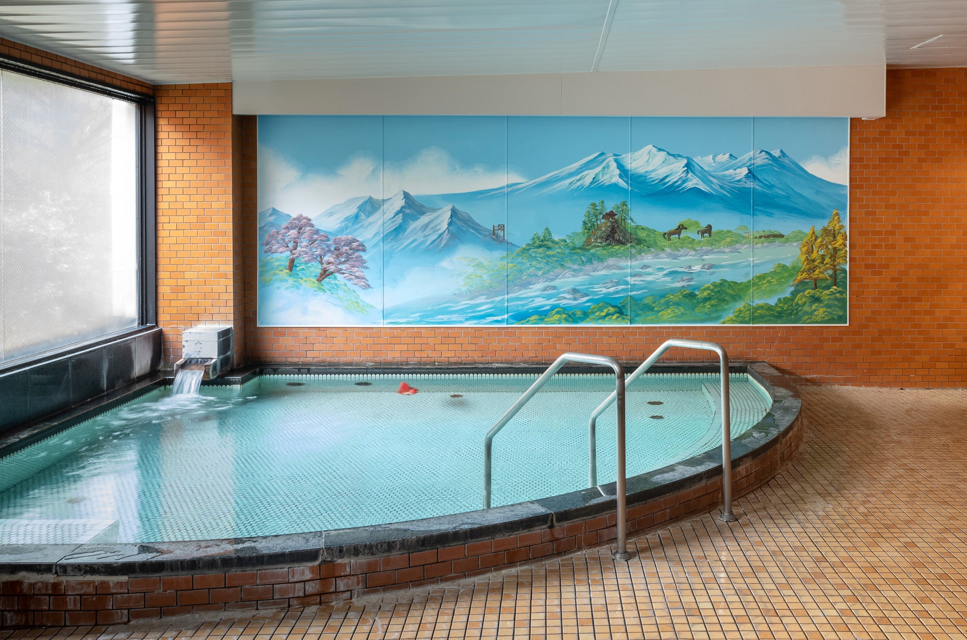 御嶽山を描いた銭湯絵を眺める薬湯風呂