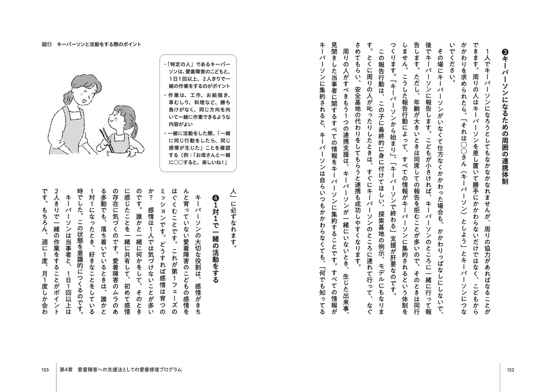 ◉愛着障害の支援は、こどもにとって「特定の人」=キーパーソンを決めて支援することが大切です。本書では、愛着障害修復プログラムによる支援で解説しています。
