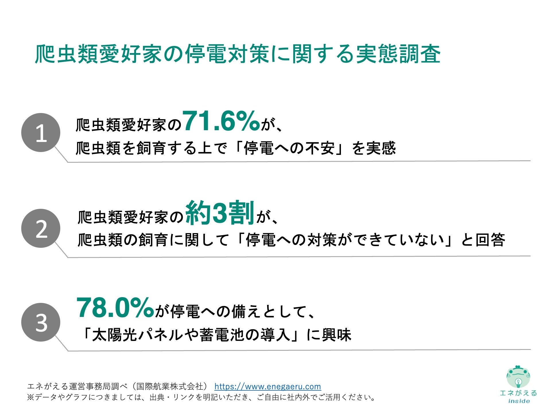 [独自レポートVol.17]『爬虫類愛好家の住宅用蓄電池ニーズは?』爬虫類愛好家の78.0%が停電への備えとして「太陽光・蓄電池の導入」に興味 71.6%が、爬虫類を飼育する上で「停電への不安」を実感