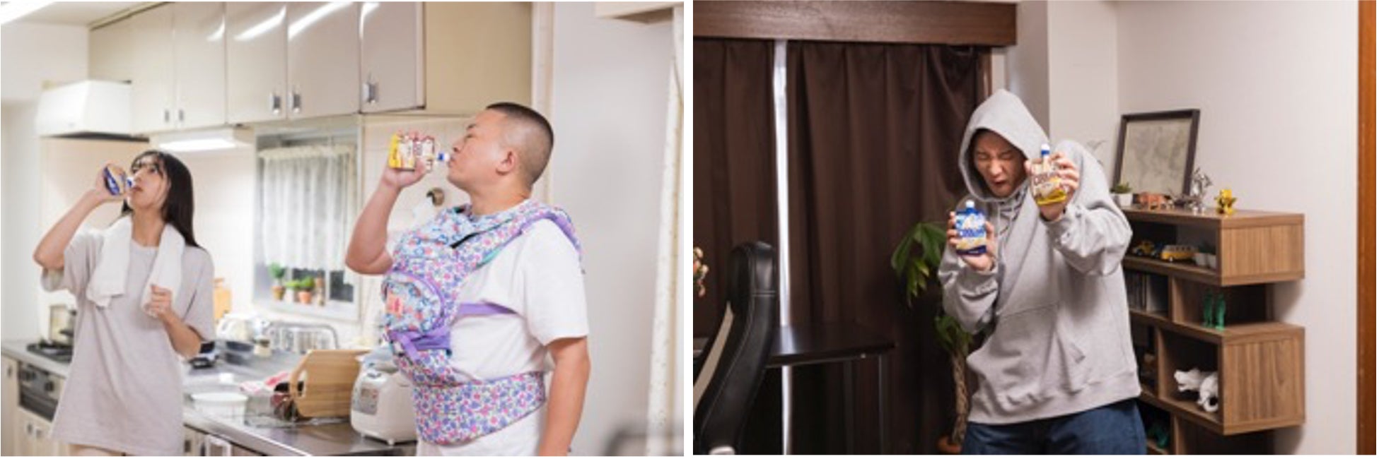 続いて、伝説の小学生 高田くんに長田さんがインタビューをするシーンでは、高田くんを演じる松尾さんのカタコトな喋り方に、少し困りながらも質問を続ける長田さんの演技に、笑いを堪えるスタッフ達。独特な二人の世界観にスタッフも引き込まれ、笑いが絶えない明るい現場となりました。その後は、松尾さん演じる本当にやさしい夫が、奥さんを気遣い一緒に「クーリッシュ」を飲むシーンの撮影に。自前の抱っこ紐で赤ちゃんの人形を抱えた松尾さんは、撮影前から赤ちゃんの背中をさすってあやす姿があり、まるでキャラクターが憑依しているかのようでした。アドリブで、「クーリッシュ」を持ちながらの“ワンハンド赤ちゃんあやし”も披露していました。