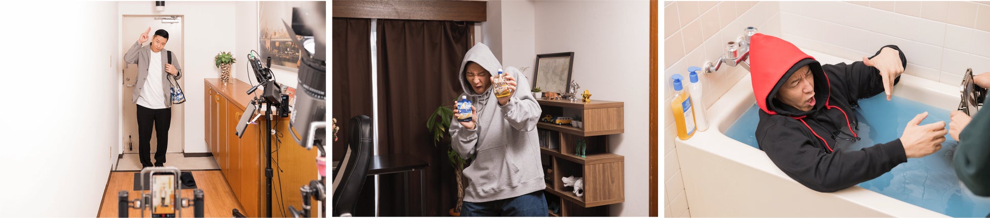その後の、長田さん演じるMr.パーカーJr.が、パーカーを着たまま入浴するシーンでは、ナレーションで後付けされる台詞をイメージして、どういう表情や振り付けが良いのかをアドリブで演技。衣装がびしょ濡れになりながらも様々なパターンを披露していました。入浴後に「クーリッシュ」を両手に華麗に踊るシーンでは、リズミカルな曲に合わせて激しく踊る長田さんの姿に、監督は、「めちゃめちゃ良い!」と大絶賛。入浴後に「クーリッシュ」を飲む気持ちよさそうな長田さんの表情にもご注目ください。