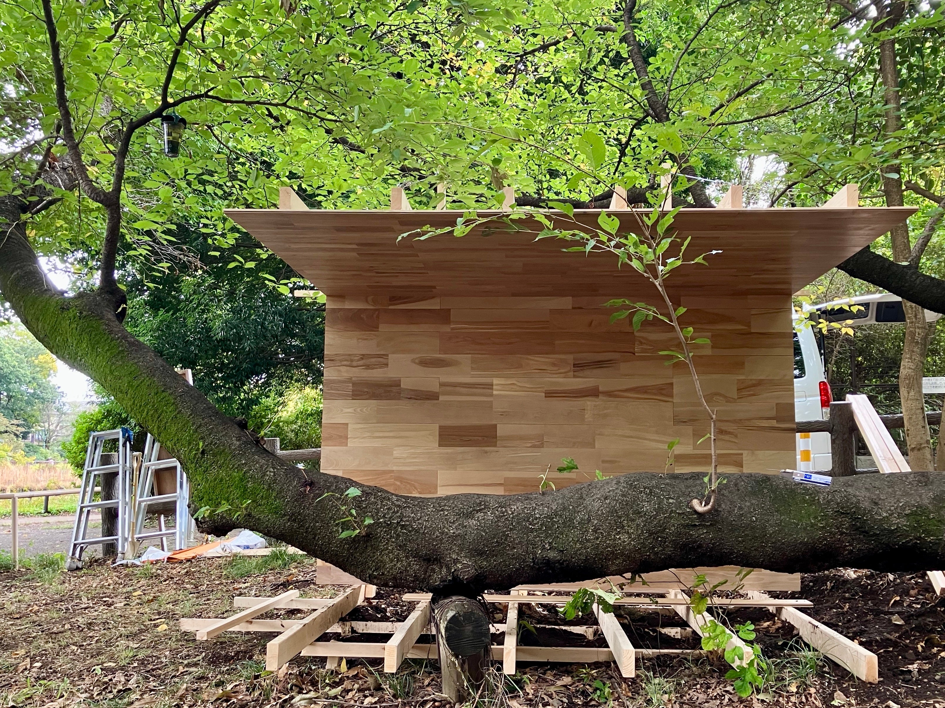 本作品は、来場者が内部に入り、光や風、木々を身体で感じながら、自然との一体感と風通しの良さを体感できるインスタレーションです。空間全体を通して、自然の中で呼吸するような心地よさを感じられる構成としました。制作には、西南桜やカバ、オークの無垢材を使用し、てまひま不動産でリノベーション工事の際に発生する余剰資材や廃材も積極的に活用。