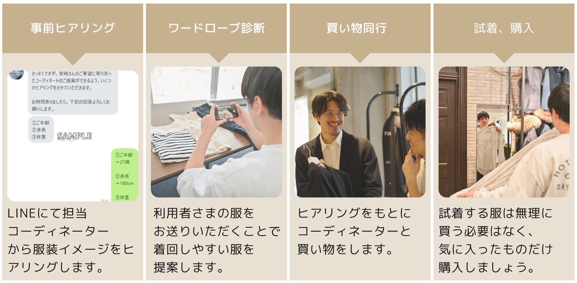 ①事前ヒアリング/②ワードローブ診断/③買い物同行/④試着、購入